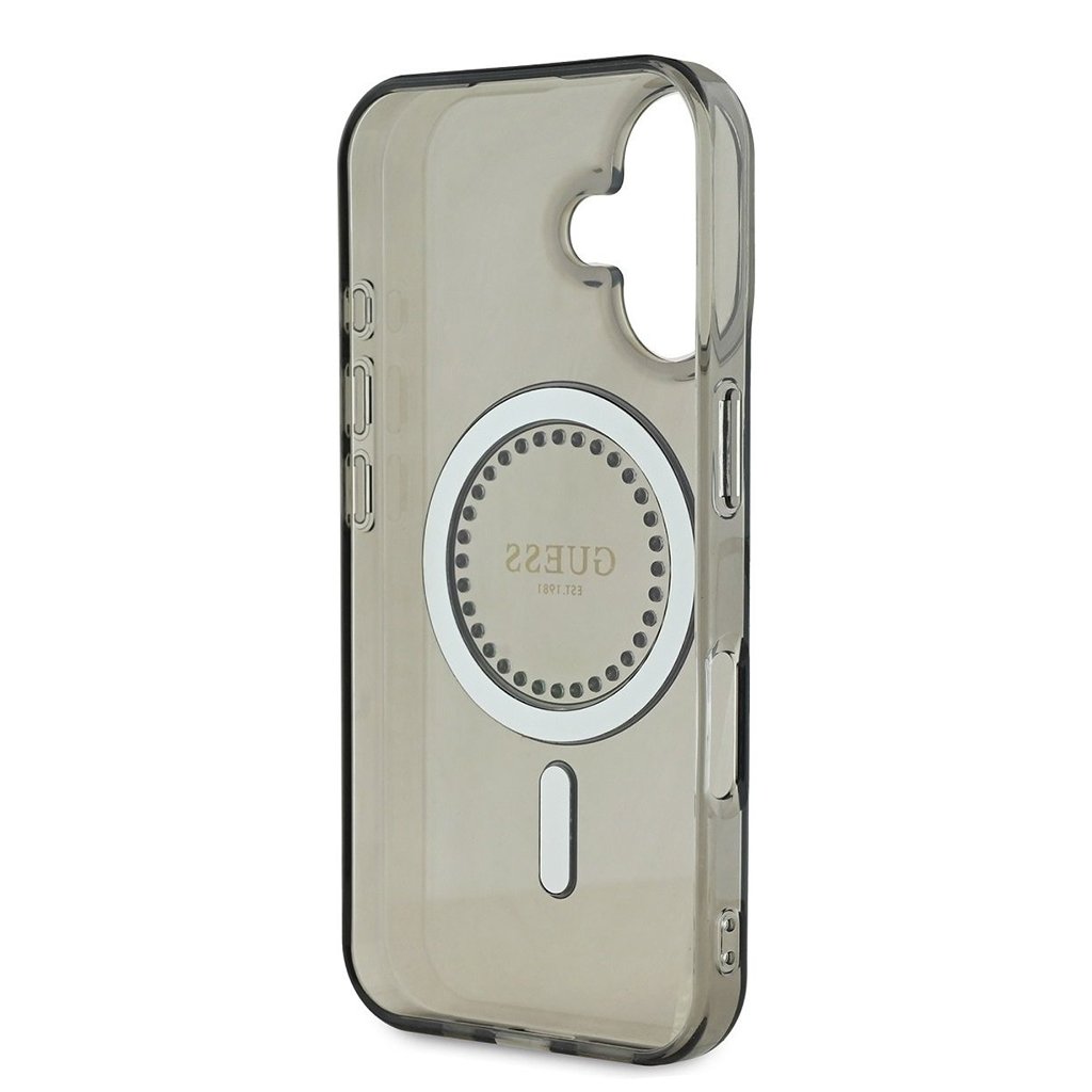 - Vo vnútri MagSafe prstenca je menší kruh trblietavých kamienkov (rhinestones), ktoré obklopujú ikonické logo "GUESS EST. 1981".