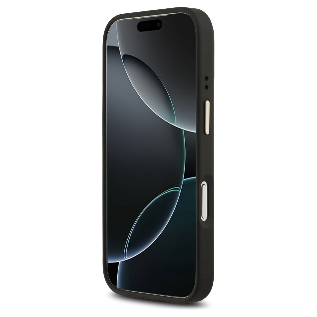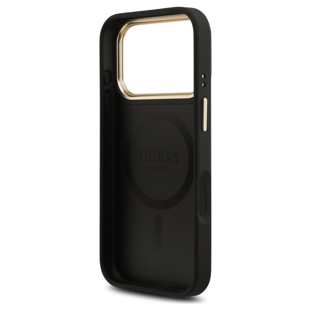 Puzdro Guess Hardcase 4G Stripe MagSafe sa pýši sofistikovaným dizajnom v čiernej farbe, ktorý je doplnený ikonickým 4G monogramom, decentne vyrazeným do textúrovaného povrchu. Stredom zadnej strany sa tiahne elegantný pruh s výrazným zlatým nápisom GUESS, ktorý okamžite upúta pozornosť a dodáva puzdru punc luxusu. Zlaté detaily sa objavujú aj na rámčeku okolo modulu fotoaparátu a na tlačidlách, čo vytvára harmonický a prémiový vzhľad.