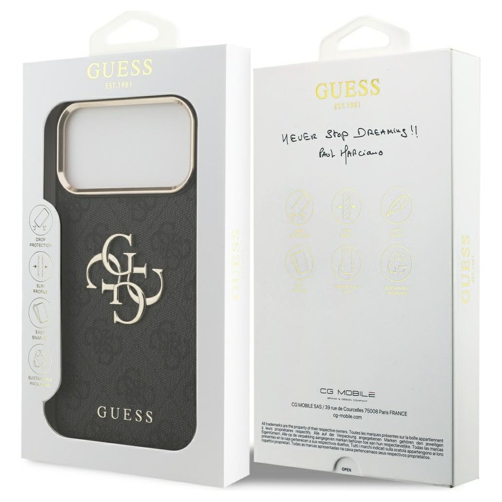 Představujeme vám exkluzívne ochranné pouzdro Guess Hardcase Big 4G Classic Logo, ktoré je navrhnuté tak, aby dokonale doplnilo váš iPhone 17 Pro Max. Tento štýlový doplnok ztelesňuje ikonický módny štýl značky Guess a zároveň poskytuje spoľahlivú ochranu pre váš telefón.