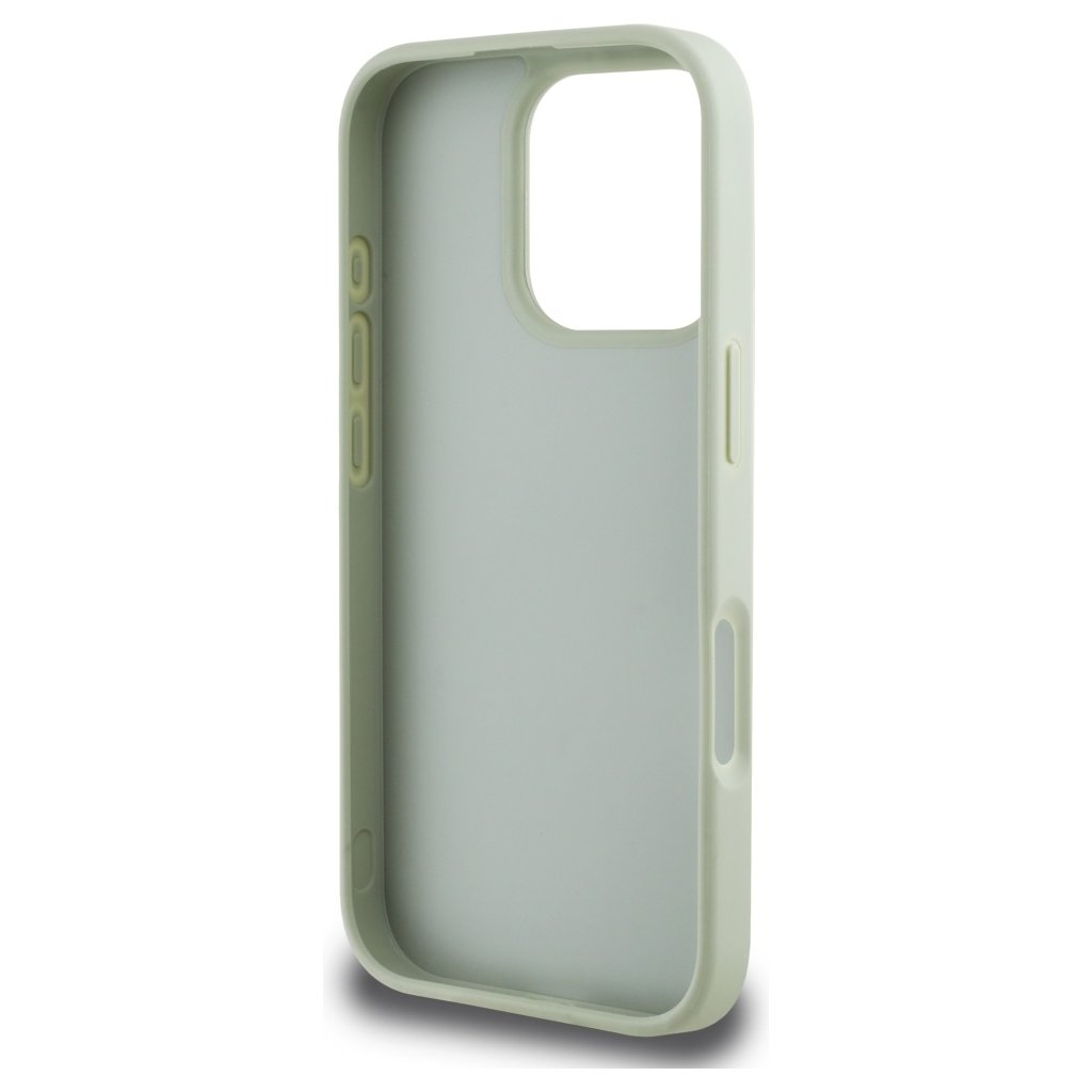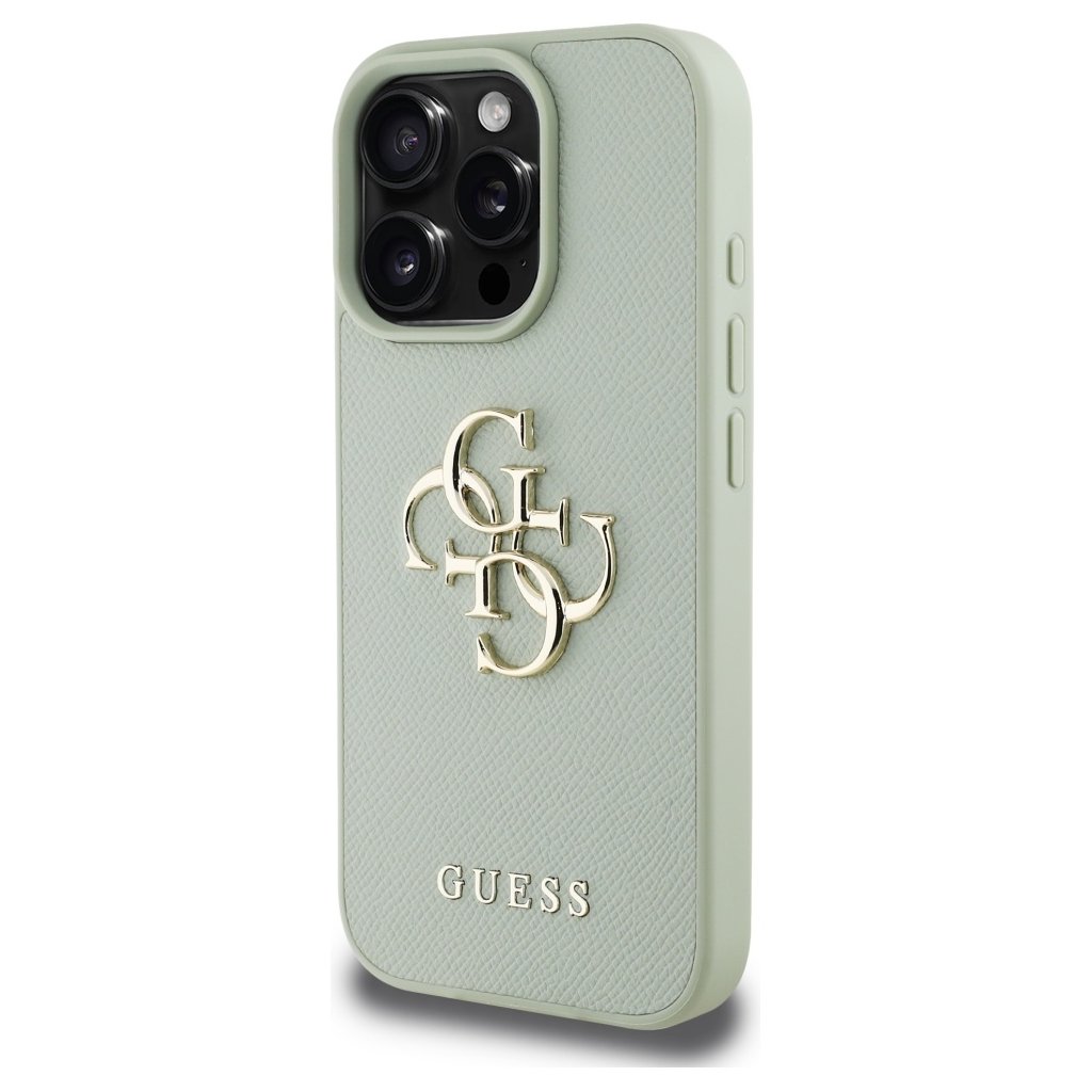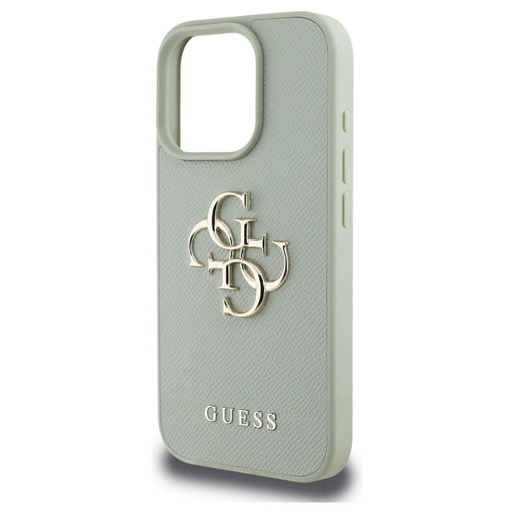 Toto puzdro Guess Hardcase sa pýši elegantným a moderným vzhľadom. Je vyrobené z odolného materiálu s jemnou zrnitou textúrou v príjemnom odtieni svetlozelenej farby, ktorá dodáva puzdru luxusný a zároveň svieži vzhľad. Dominantným prvkom na zadnej strane je výrazné, zlaté kovové logo 4G, ktoré je ikonickým symbolom značky Guess a okamžite upúta pozornosť. Pod ním sa nachádza menší, decentný nápis GUESS vo zlatej farbe, ktorý dopĺňa celkový dizajn.