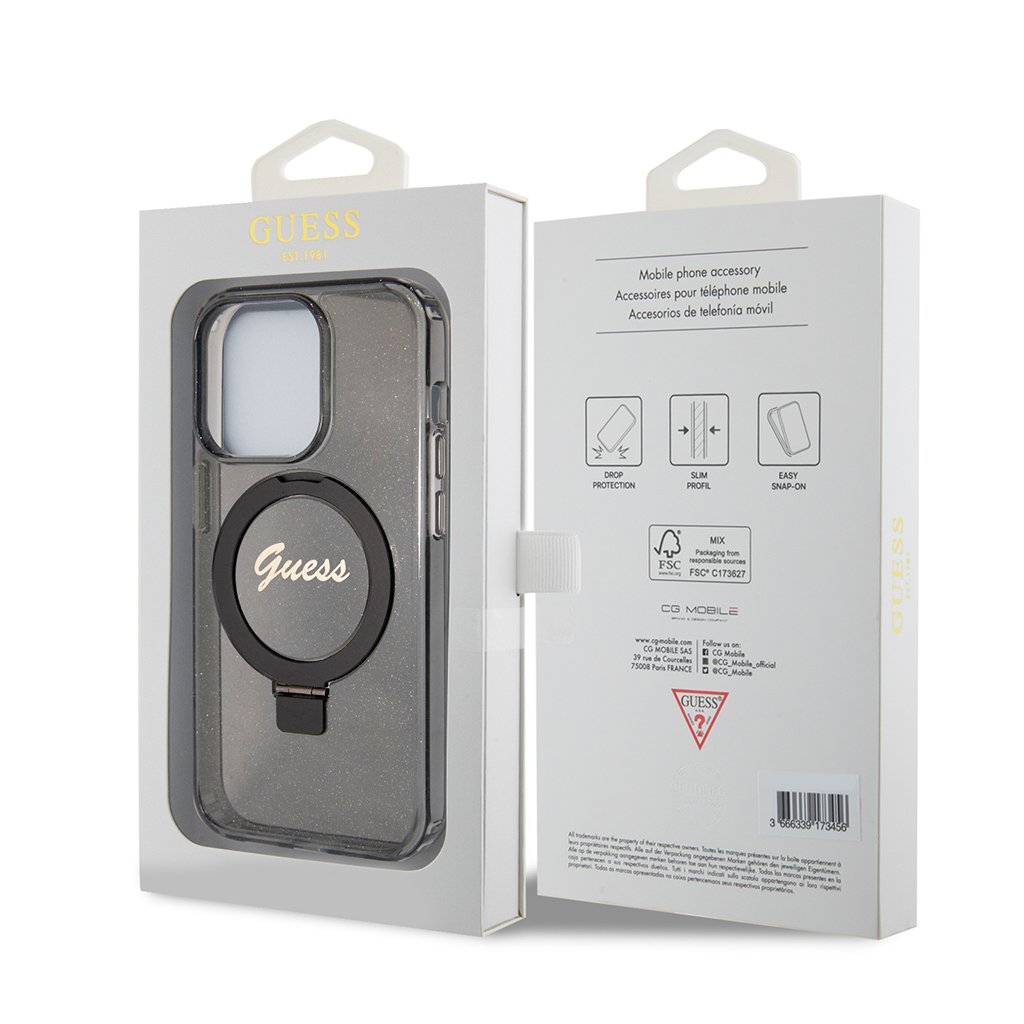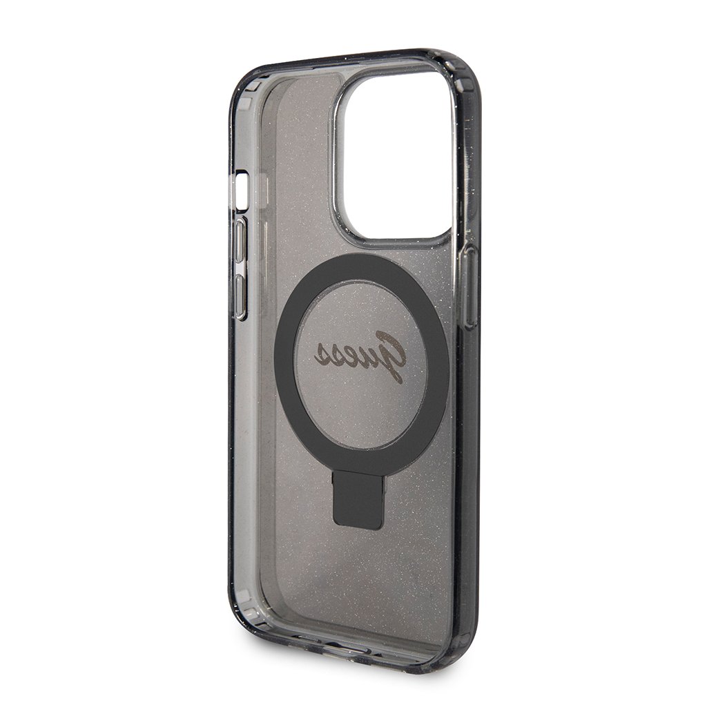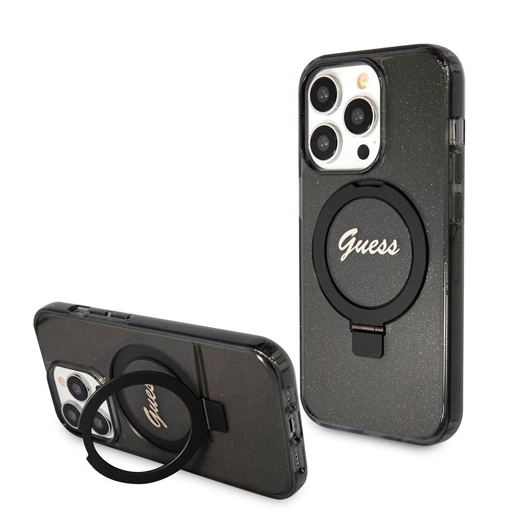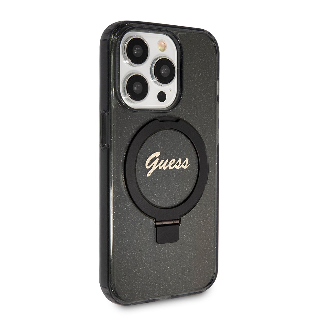 Guess Ring Stand Script Glitter MagSafe iPhone 15 Pro - Čierny