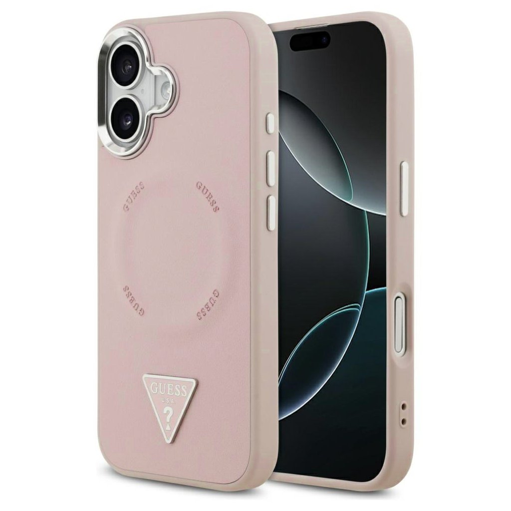 * **Typ produktu:** Ochranné puzdro (Hardcase) * **Značka:** Guess * **Model:** Triangle Logo MagSafe * **Kompatibilita:** iPhone 17 * **Farba:** Ružová * **Materiál:** Odolný plast (presný typ materiálu nie je špecifikovaný, ale ide o tvrdé puzdro) * **Dizajn:** * Strieborné trojuholníkové logo Guess s otáznikom * Decentne vyrazené opakujúce sa logo "GUESS" v kruhovom vzore pre MagSafe * Lesklý strieborný rámček okolo fotoaparátu * **Funkcie:** * Kompatibilita s technológiou **MagSafe** pre bezdrôtové nabíjanie a pripojenie príslušenstva * Presné výrezy pre porty a reproduktory * Kryty tlačidiel pre ochranu a pohodlné ovládanie * Ochrana proti poškriabaniu a ľahkým nárazom * **Kód produktu:** GUHMP17SPSDTSCMPDodatočné parametre