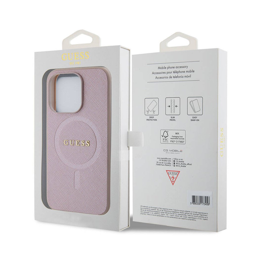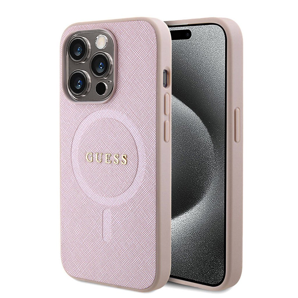 Guess Saffiano MagSafe puzdro iPhone 15 Pro ružové