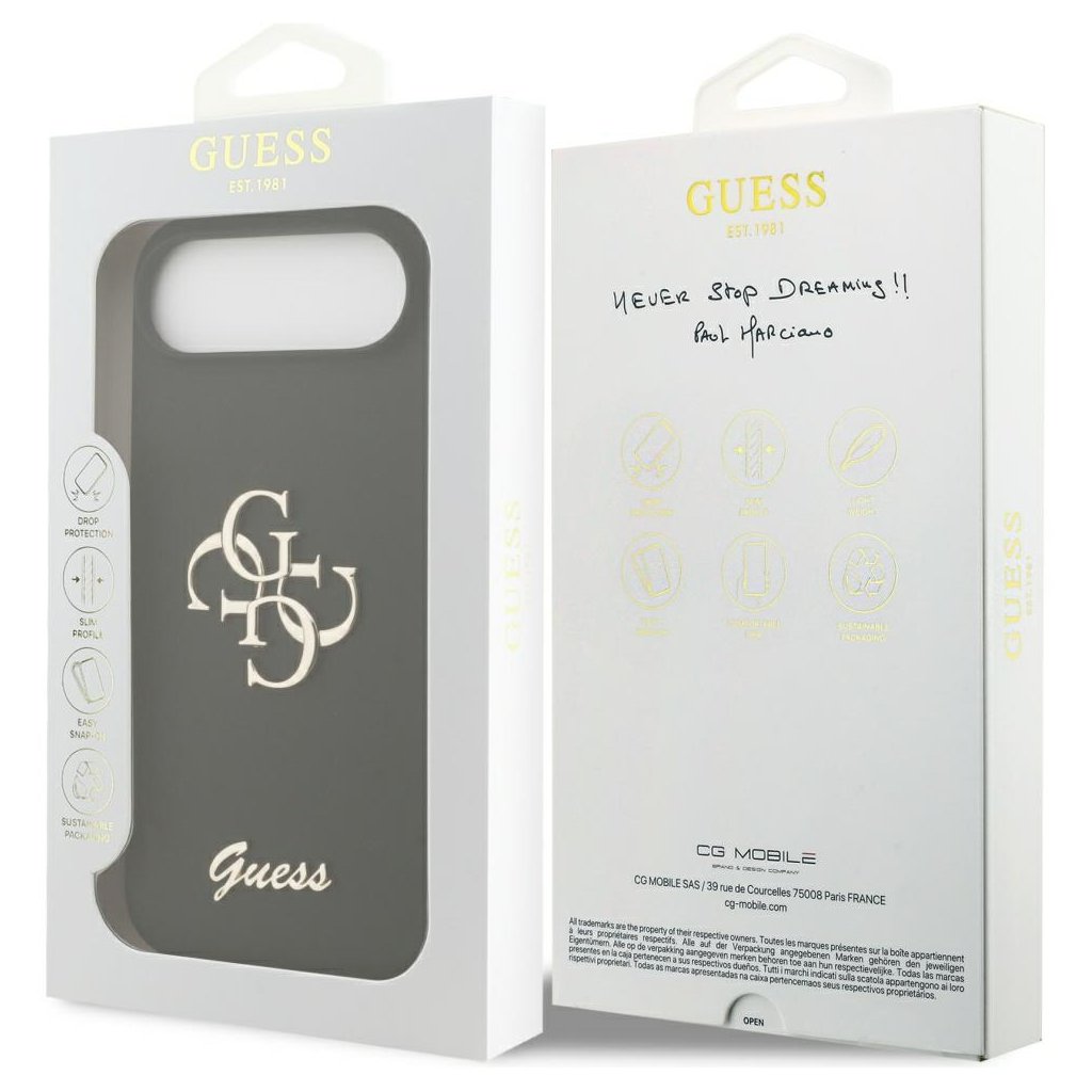 Puzdro Guess Silicone Big 4G Script pre iPhone 17 Air je ztelesnením elegancie a moderného štýlu. Je vyrobené z vysoko kvalitného silikónu, ktorý je príjemný na dotyk a zároveň poskytuje spoľahlivú ochranu proti poškriabaniu, prachu a drobným nárazom. Hlboká čierna farba puzdra dodáva telefónu sofistikovaný vzhľad. Dominantným prvkom dizajnu je veľké, zlaté logo Guess 4G, ktoré je umiestnené centrálne na zadnej strane a pod ním je elegantným písmom vyvedený nápis "Guess". Tento dizajnový prvok okamžite upúta pozornosť a podčiarkuje luxusný charakter značky. Presné výrezy zaisťujú jednoduchý prístup ku všetkým portom a tlačidlám, zatiaľ čo zvýšené okraje chránia displej a fotoaparát pred priamym kontaktom s povrchom.