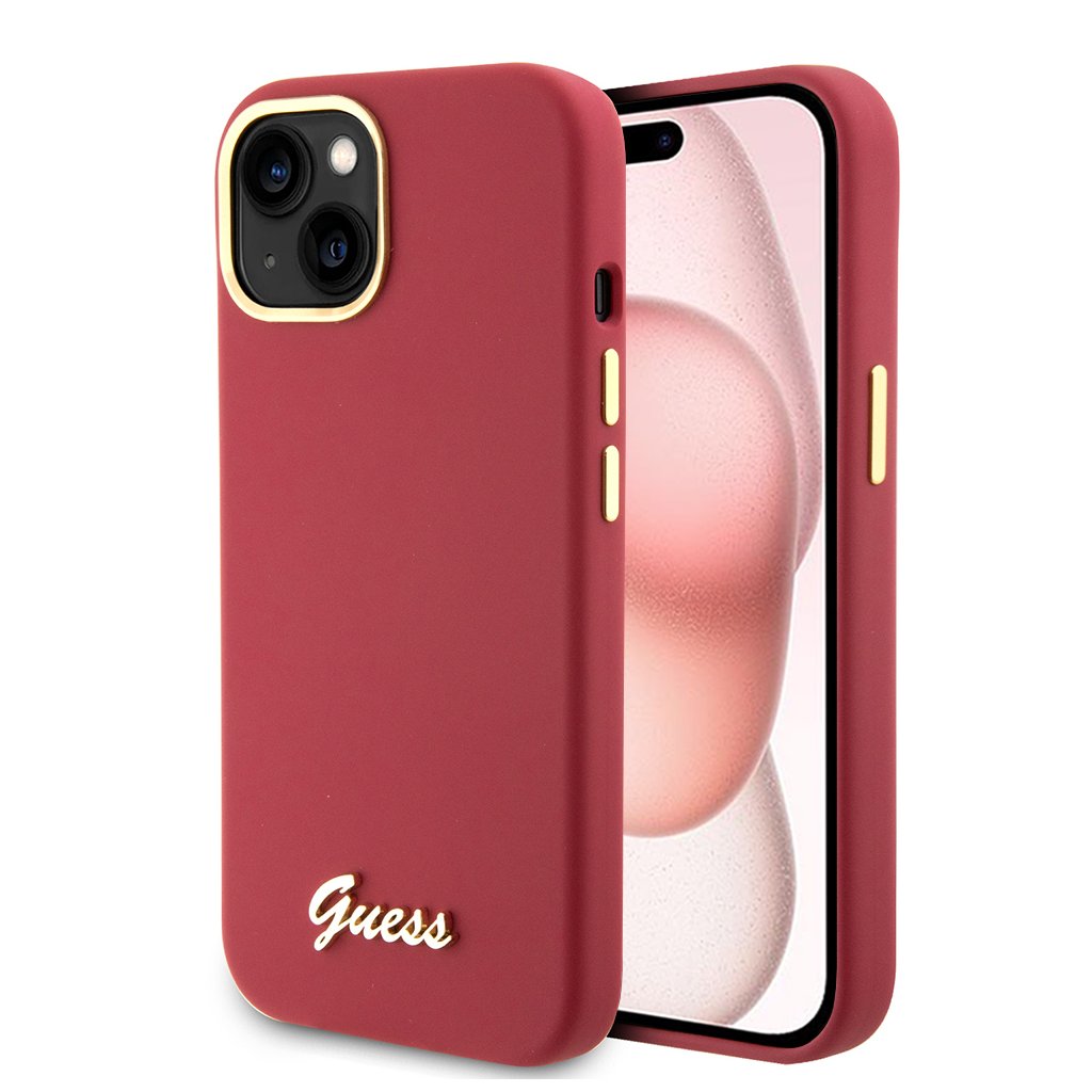 Guess Silicone Script Metal Logo & Frame (GUHCP15SSMBSLM) – iPhone 15 – červená