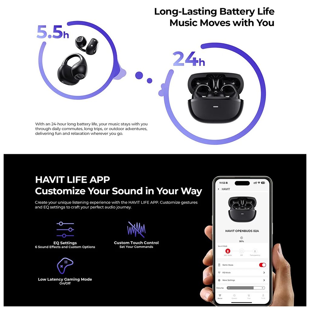 Slúchadlá Havit OWS916 sa pýšia moderným a minimalistickým dizajnom v matne čiernej farbe, ktorá podčiarkuje ich eleganciu. Ich ergonomický tvar s otvoreným dizajnom a jemnými háčikmi za uši zaisťuje maximálny komfort aj pri dlhodobom nosení a bezpečné uchytenie, takže sa nemusíte obávať ich vypadnutia ani pri intenzívnom pohybe. Kompaktné nabíjacie puzdro, rovnako v čiernej farbe, je nielen praktické pre dobíjanie na cestách, ale aj skvele dopĺňa celkový vzhľad slúchadiel. Vďaka svojmu nenápadnému prevedeniu sa hodí k akémukoľvek štýlu.