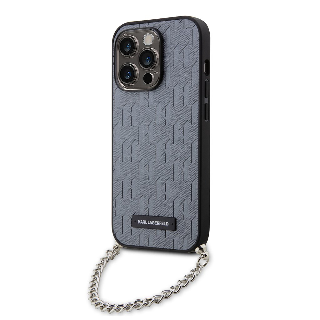 Karl Lagerfeld Saffiano Monogram Chain pre iPhone 14 Pro strieborná