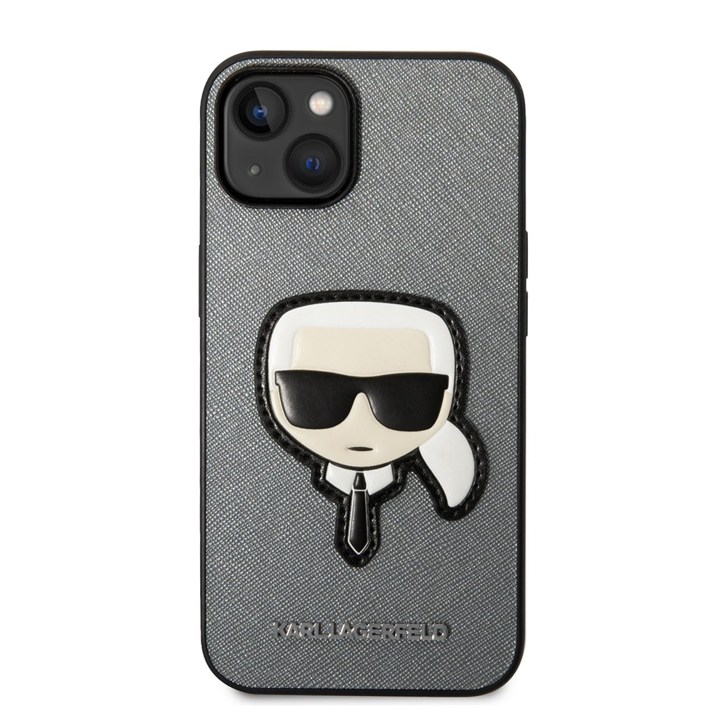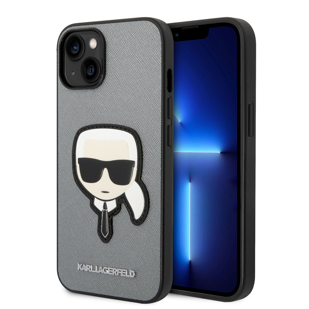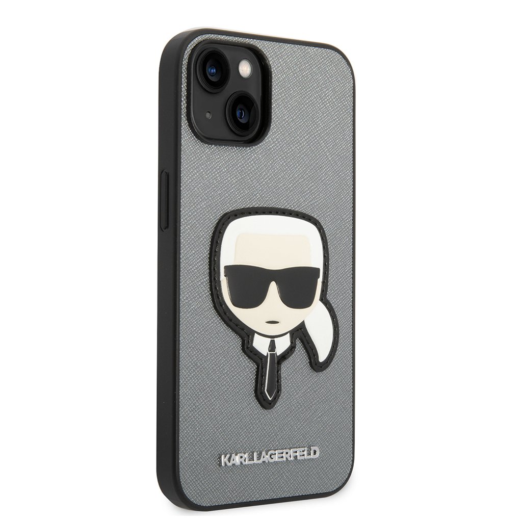 Karl Lagerfeld Saffiano puzdro iPhone 14 Plus strieborné Karlova hlava