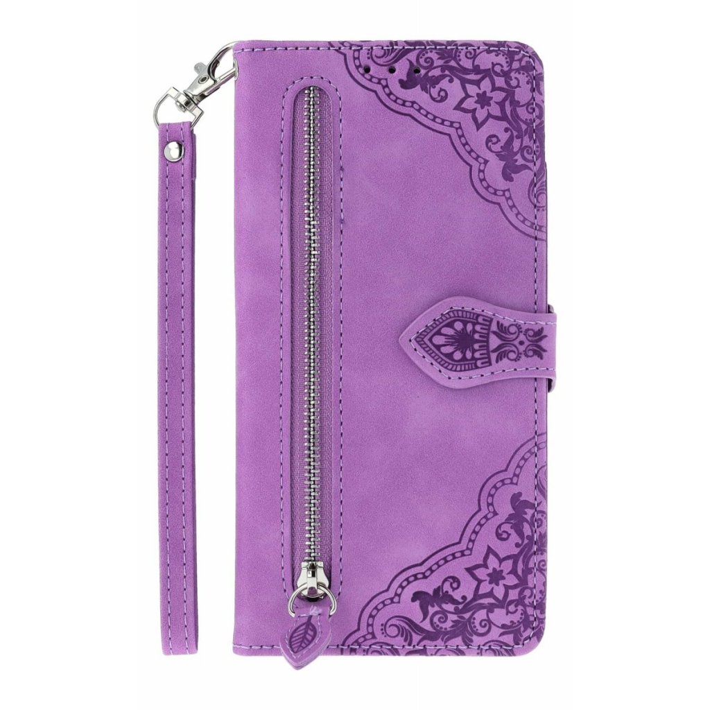 Knižkové púzdro na Xiaomi Redmi Note 14 so zipsom fialovéKnižkové púzdro na Xiaomi Redmi Note 14 - Fialové flipové púzdro s čipkovým vzorom