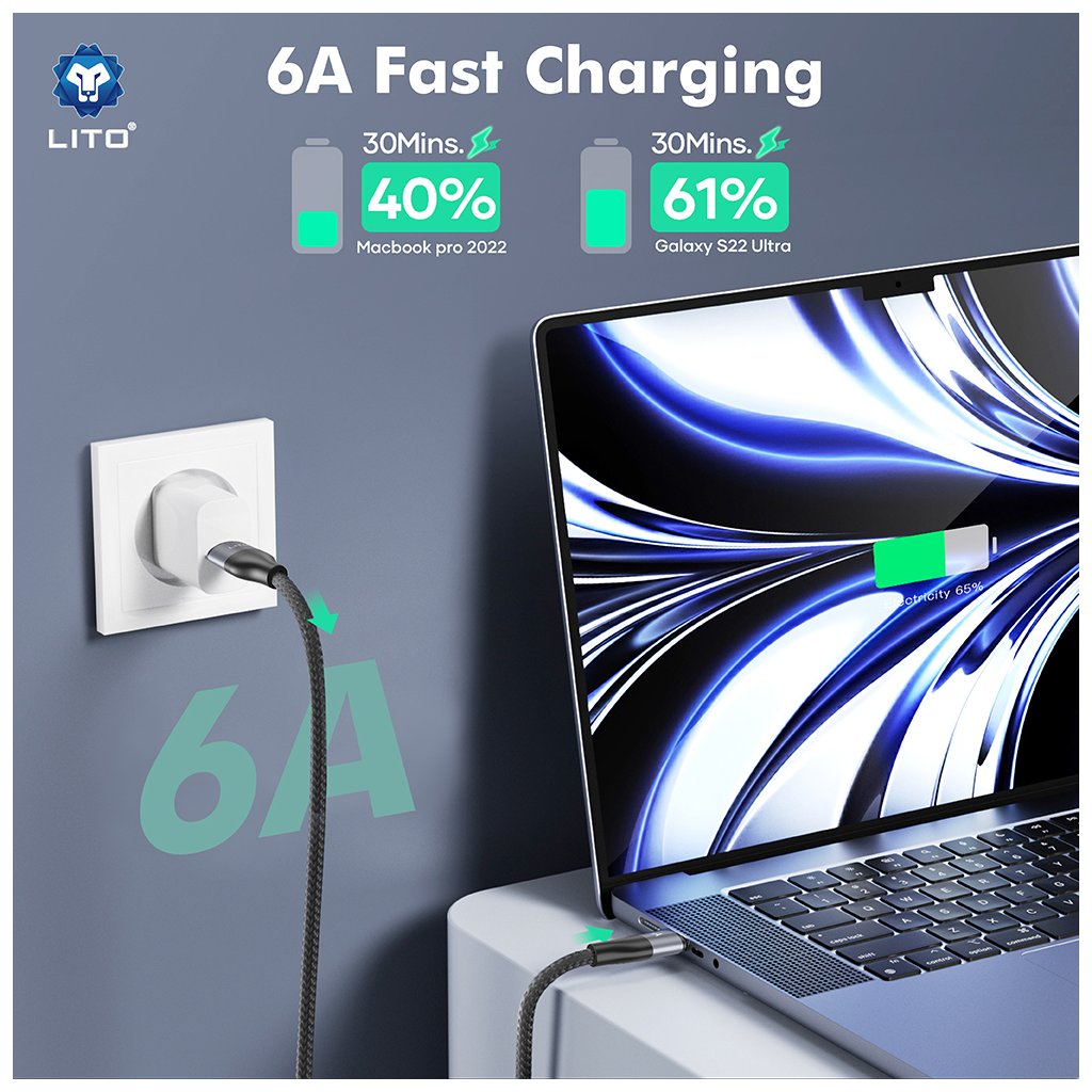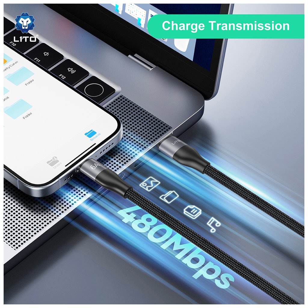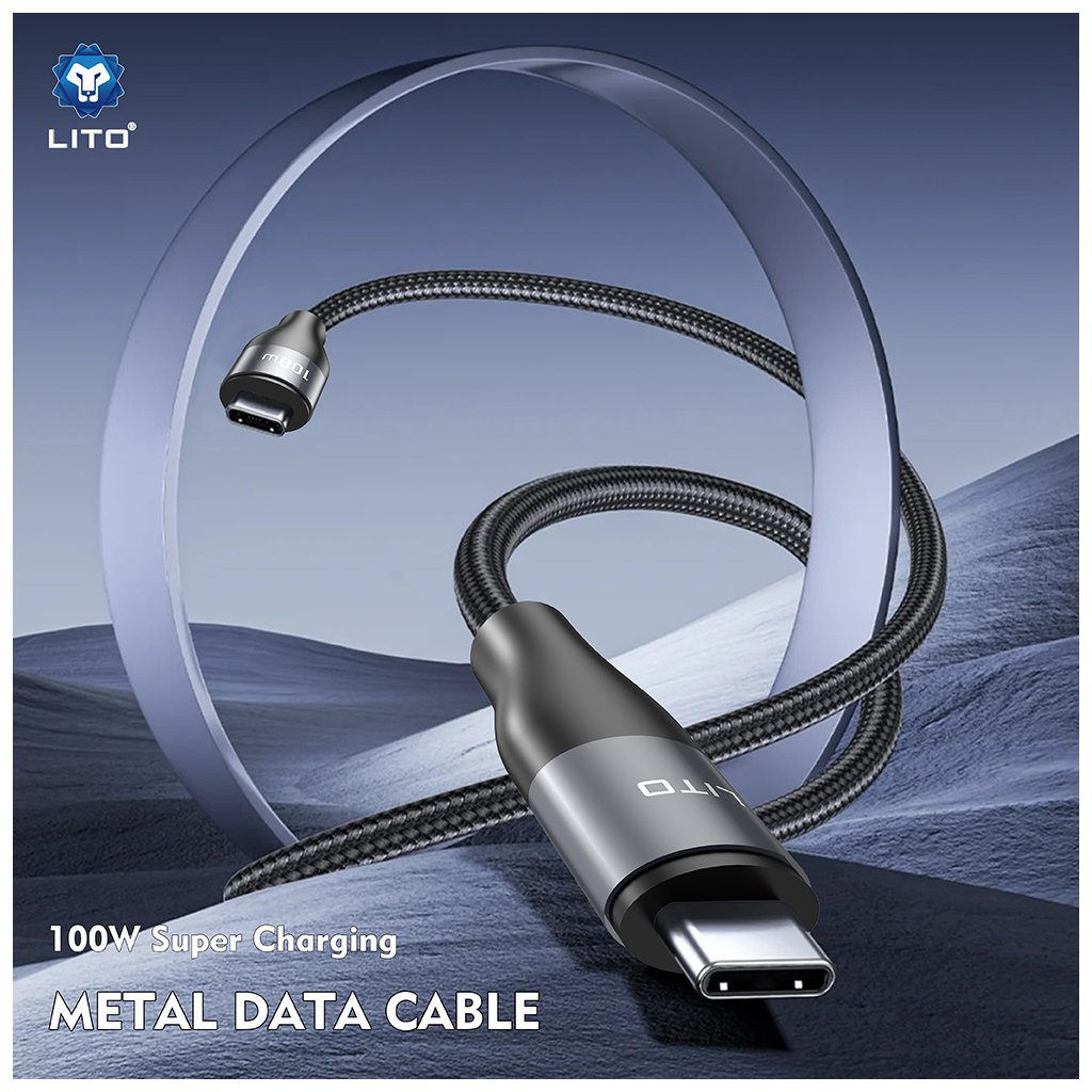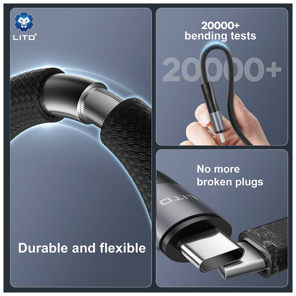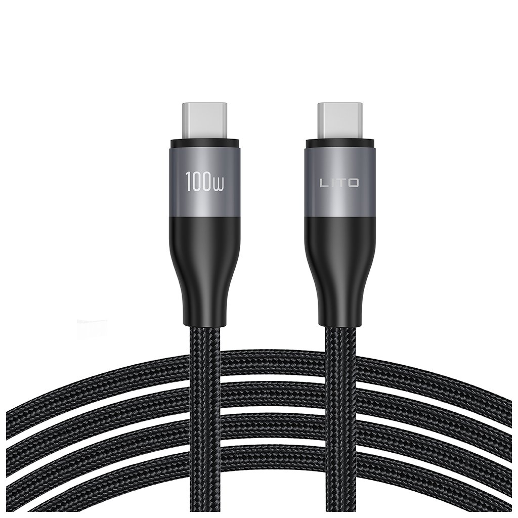 Kábel Lito LD25CC sa pýši prémiovým dizajnom a robustnou konštrukciou. Jeho telo je opletené vysoko kvalitným nylonom v elegantnej tmavej farbe, čo zaisťuje nielen výnimočnú odolnosť proti opotrebovaniu a zamotaniu, ale aj príjemný pocit na dotyk. Kovové koncovky konektorov Type-C v šedom odtieni dodávajú káblu moderný a sofistikovaný vzhľad. Jedna z koncoviek je decentne označená logom LITO, zatiaľ čo druhá hrdlo nesie označenie 100W, čo podčiarkuje jeho schopnosť dodávať vysoký výkon. Vďaka zosilneným spojom medzi káblom a konektormi je minimalizované riziko poškodenia pri častom ohýbaní, čo potvrdzujú aj testy s viac ako 20 000 ohybmi.