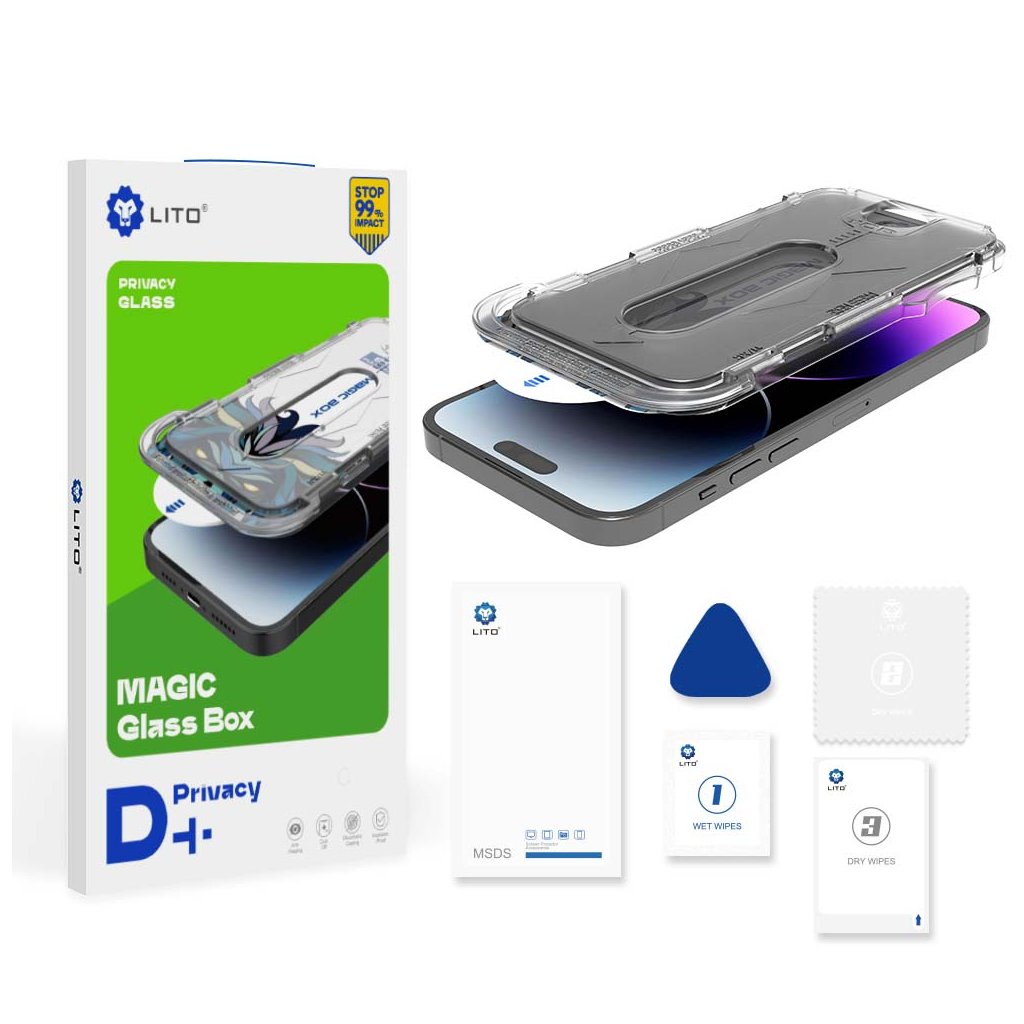 Predstavujeme Lito Magic Glass Box D+ Tools Privacy, špičkové tvrdené sklo navrhnuté pre maximálnu ochranu a súkromie vášho iPhone 16 Pro Max. Tento produkt je výsledkom dlhoročného vývoja značky Lito, ktorá sa od roku 2011 výhradne špecializuje na prémiovú ochranu displejov a je uznávaným OEM/ODM dodávateľom pre mnoho svetových značiek. Vďaka neustálym investíciám do výskumu a vývoja (R&D) prináša Lito inovatívne riešenia, ktoré kombinujú špičkovú kvalitu materiálov a pokročilé výrobné technológie za dostupnú cenu. Dizajn a precízna aplikácia Ochranné sklo Lito Magic Glass Box D+ Tools Privacy sa vyznačuje elegantným čiernym prevedením, ktoré dokonale splynie s dizajnom vášho telefónu a zároveň zaistí privátny filter, chrániaci obsah displeja pred zvedavými pohľadmi zboku. Súčasťou balenia je inovatívny aplikačný rámček Magic Box v priehľadnej farbe, ktorý je navrhnutý pre jednoduchú a absolútne presnú inštaláciu bez bublín. Rámček je označený nápismi "MAGIC BOX" a "PRESS HERE", čo zaručuje intuitívnu a bezchybnú aplikáciu aj pre neskúsených používateľov. Vďaka tomuto premyslenému dizajnu je inštalácia rýchla a efektívna, čo eliminuje riziko nesprávneho nalepenia. Kľúčové vlastnosti a parametre- Tvrdosť 9H: Zaisťuje extrémnu odolnosť proti poškriabaniu a nárazom.