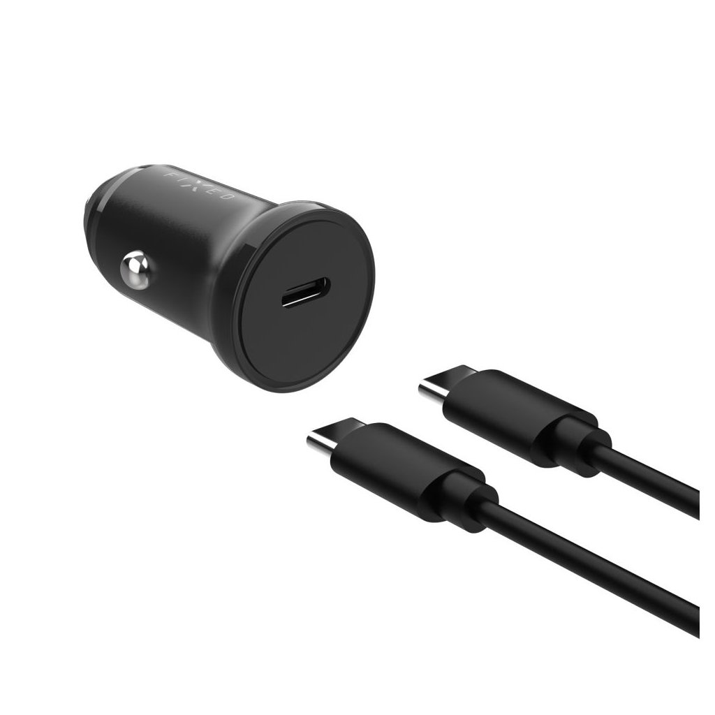 Nabíjačka do auta FIXED s výstupom USB-C a káblom USB-C/USB-C, podpora PD, 1 meter, 20 W, čierna