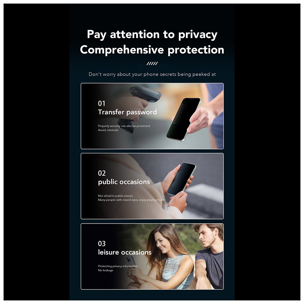 - Inovatívna technológia 360° Privacy: Obrazovka sa stáva nečitateľnou pre kohokoľvek, kto sa na ňu pozerá z uhla, čo vám poskytuje absolútne súkromie v akejkoľvek situácii – či už cestujete v MHD, pracujete v kaviarni alebo ste na verejnosti.