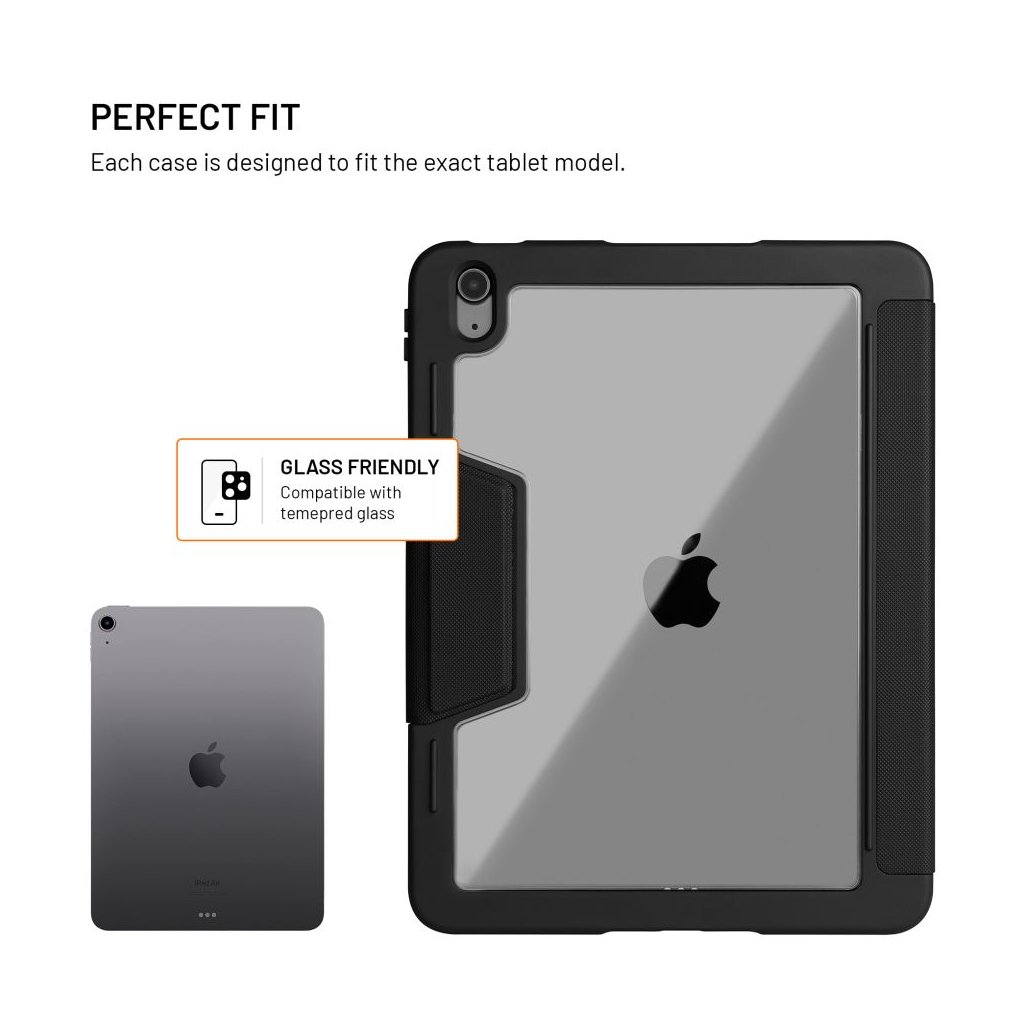 Odolné puzdro pre iPad so zosilneným TPU rámom a priehľadnou polykarbonátovou zadnou časťou, elegantnými prednými klopami z umelej kože a integrovaným stojanom s magnetickým uzáverom.