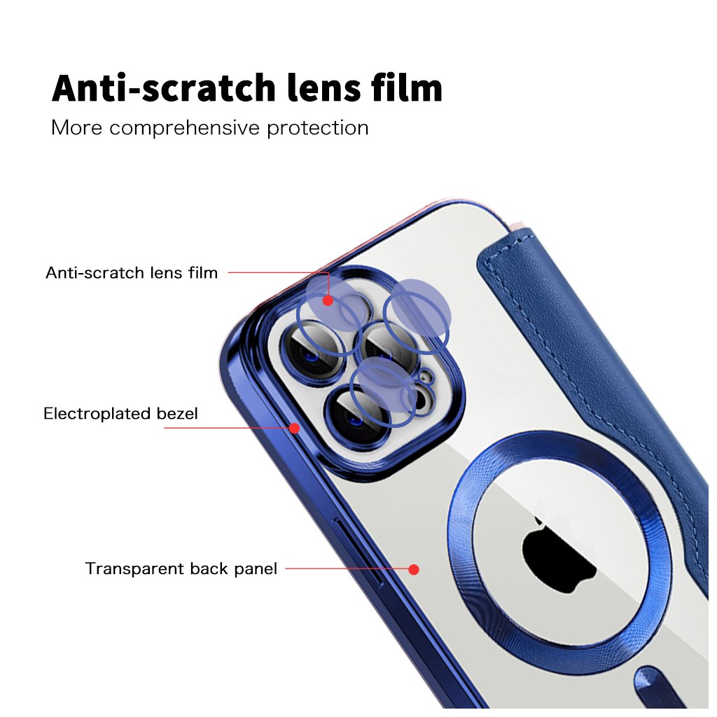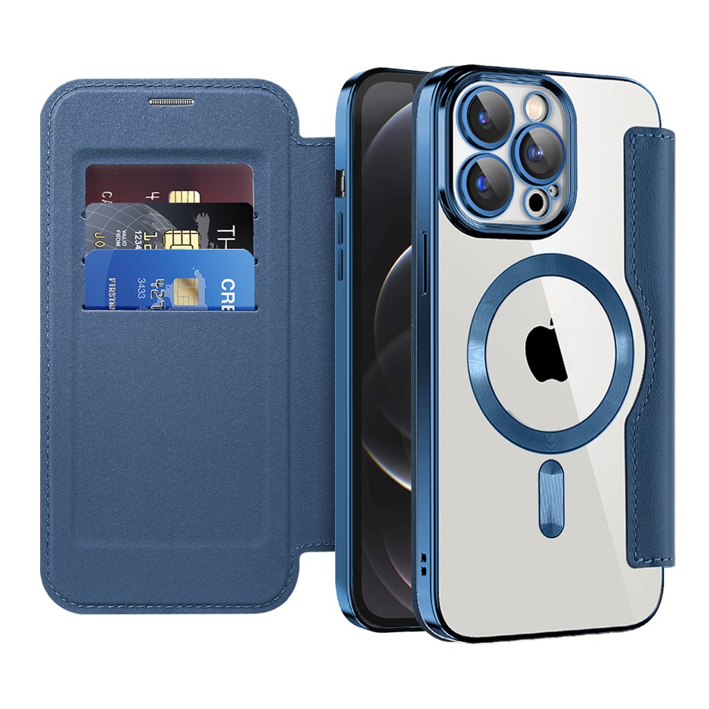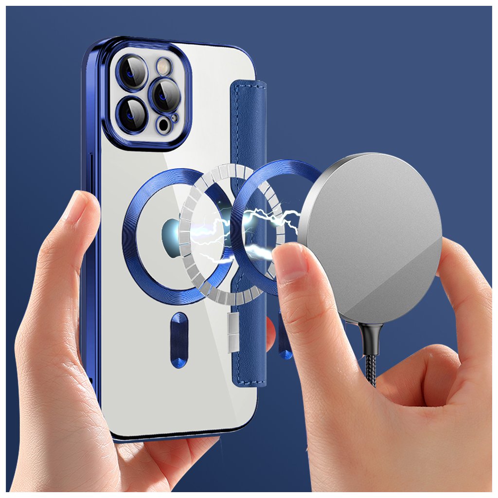 Toto elegantné puzdro typu "kniha" v atraktívnej modrej farbe je vyrobené z kvalitnej syntetickej kože, ktorá je príjemná na dotyk a zároveň poskytuje spoľahlivú ochranu proti poškriabaniu, pádom a každodennému opotrebovaniu. Vnútorná strana puzdra je vybavená praktickými priehradkami na karty, čo z neho robí ideálneho spoločníka pre tých, ktorí chcú mať všetko dôležité po ruke. Telefón je bezpečne uchytený v priehľadnej vaničke, ktorá zvýrazňuje jeho originálny dizajn a zároveň ponúka kompatibilitu s MagSafe príslušenstvom vďaka integrovanému magnetickému krúžku. Precízne spracovanie zaisťuje, že všetky výrezy pre konektory, mikrofóny, reproduktory a fotoaparáty sú dokonale presné, a tlačidlá majú istý stisk pre bezproblémové ovládanie.