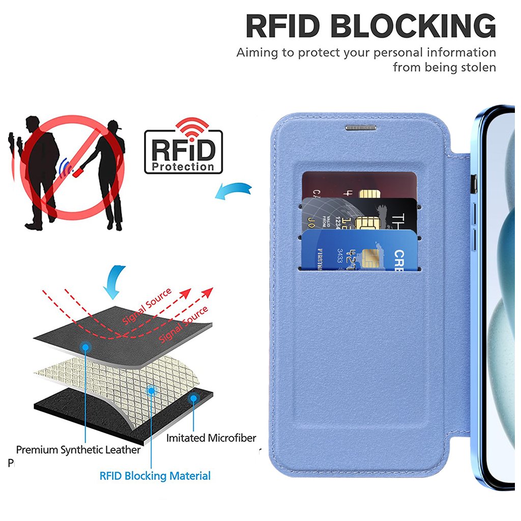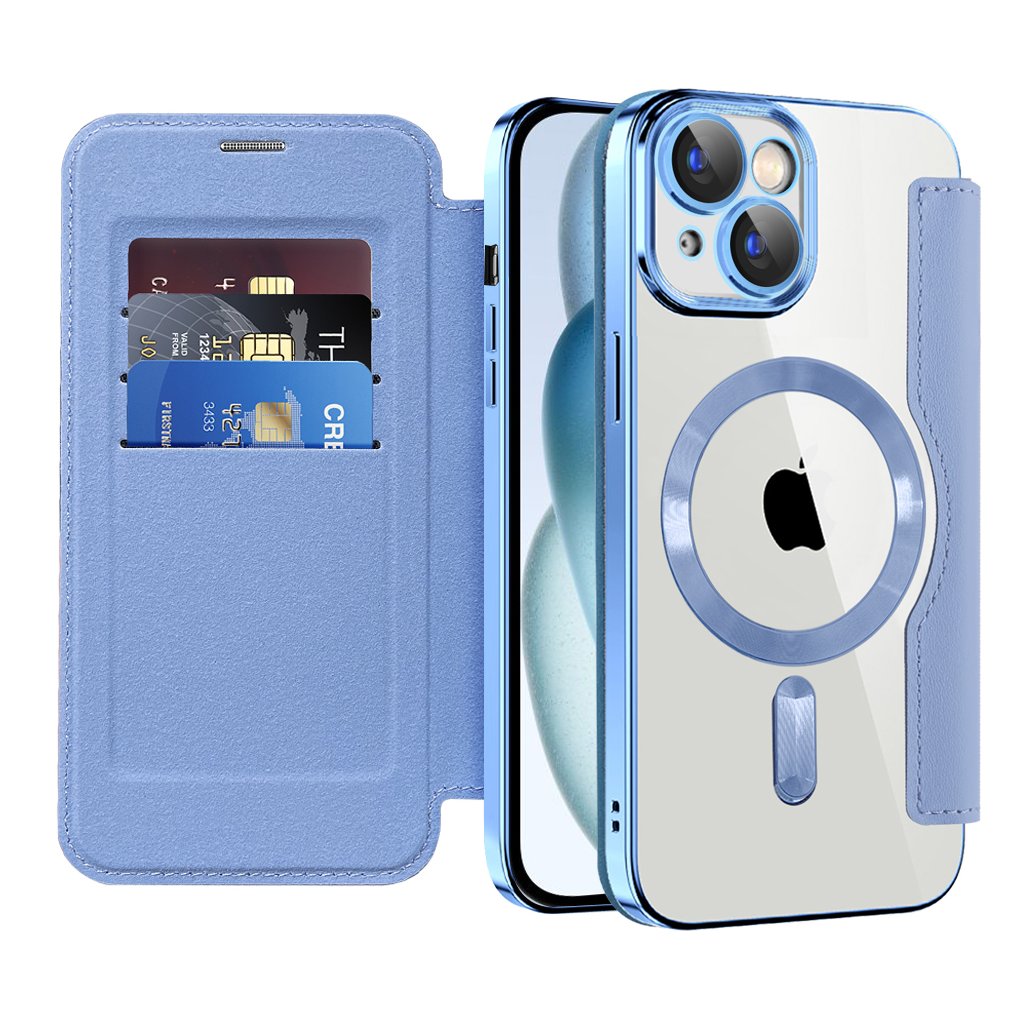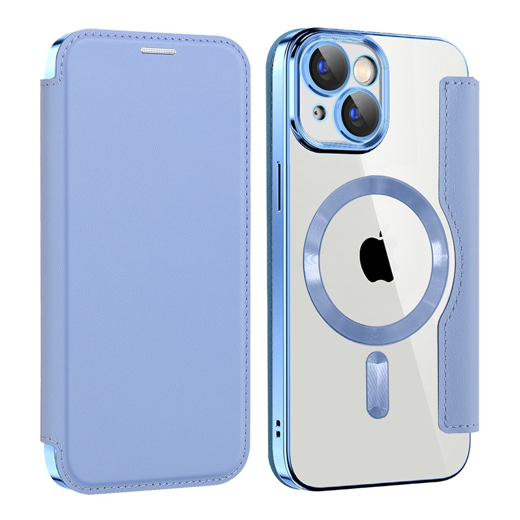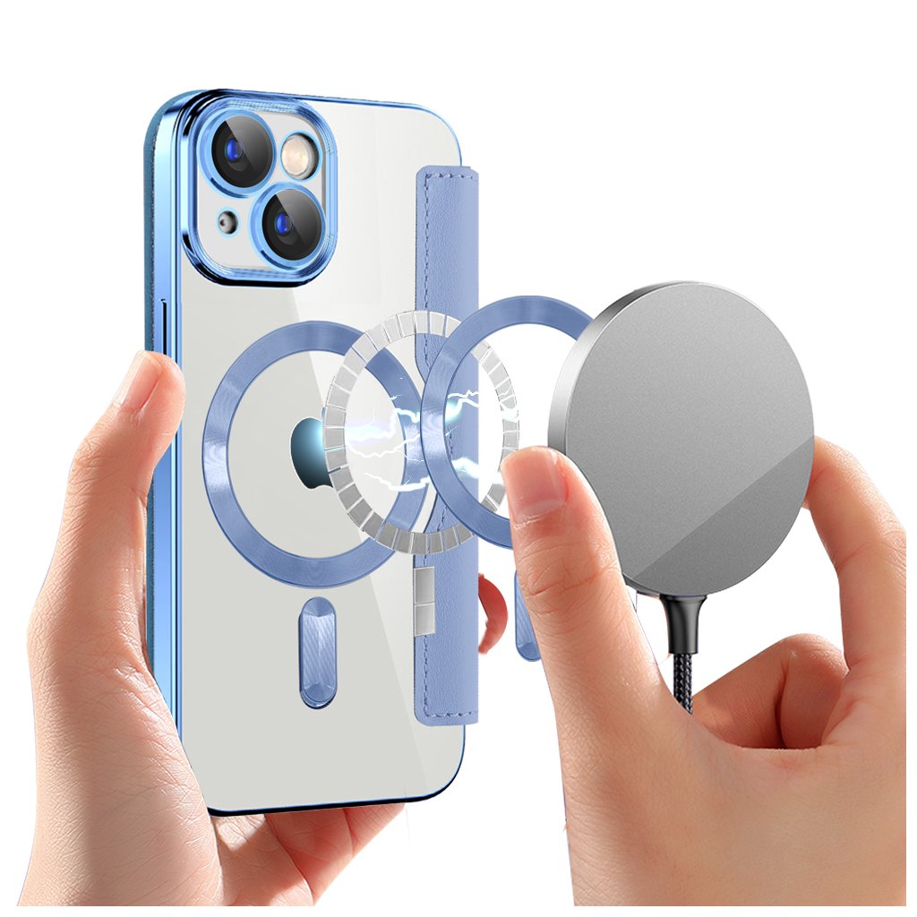 Puzdro Techsuit SmartMag sa pýši premysleným dizajnom, ktorý kladie dôraz na detail a používateľský komfort. Vonkajšia časť je vyrobená z prémiovej syntetickej kože, ktorá je príjemná na dotyk a dodáva puzdru luxusný vzhľad. Vnútorná strana prednej klopy je potiahnutá imitovaným mikrovláknom, ktoré chráni displej vášho telefónu pred poškriabaním. Telefón je bezpečne usadený v transparentnej zadnej časti, ktorá necháva vyniknúť originálny dizajn vášho iPhonu, zatiaľ čo elektrolyticky pokovený rám v ladiacej svetlo modrej farbe elegantne obopína okraje a modul fotoaparátu.