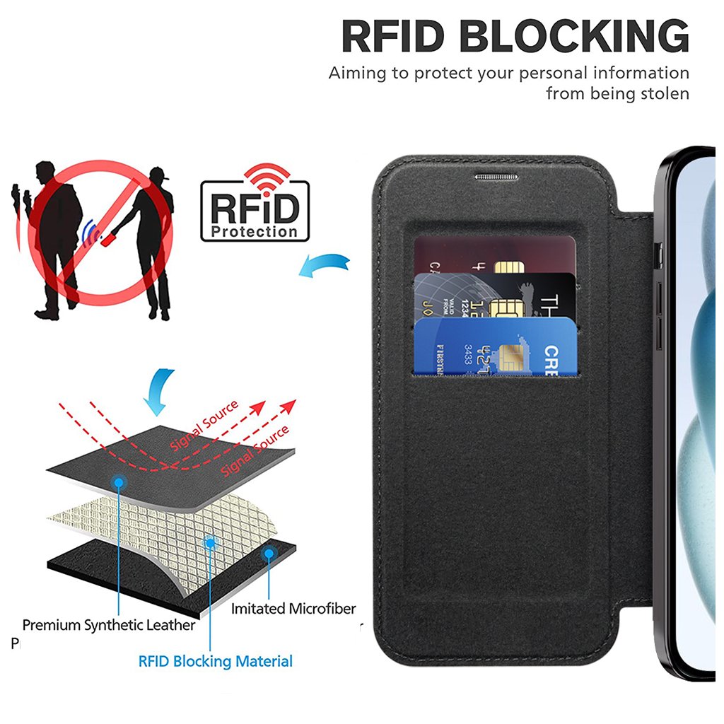 Puzdro sa pýši nadčasovým dizajnom v matne čiernej farbe, ktorá dodáva vášmu telefónu profesionálny a elegantný vzhľad. Vonkajšia strana je vyrobená z materiálu s jemnou textúrou, príjemnou na dotyk a odolnou proti každodennému opotrebovaniu. Vnútorná strana odklápacieho krytu ponúka dva praktické sloty na karty, ideálne pre uloženie platobných kariet, občianskeho preukazu alebo vizitiek, čím efektívne nahradí vašu peňaženku.