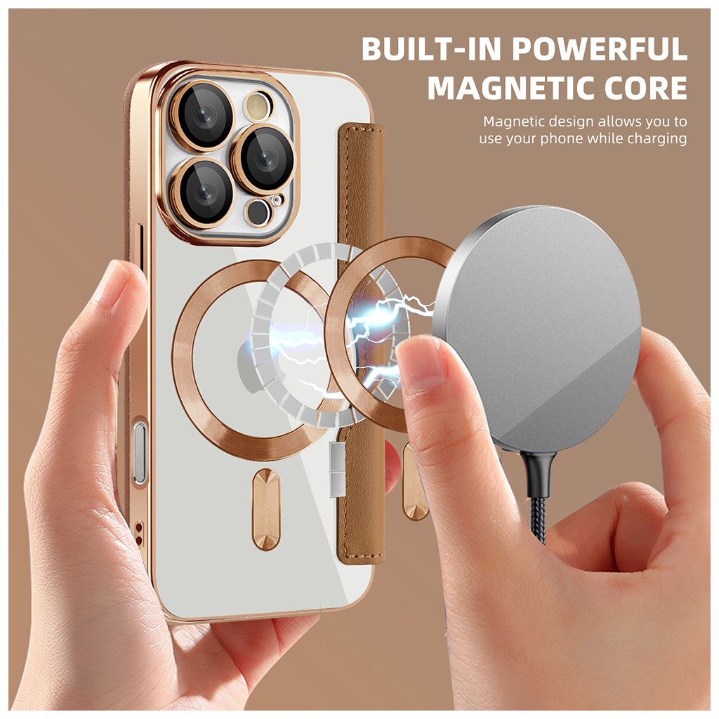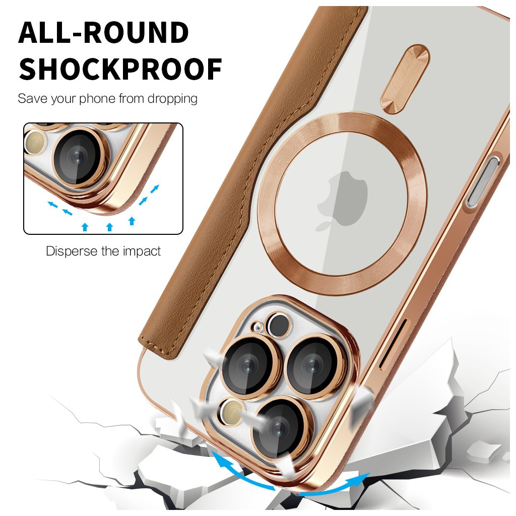 Puzdro Techsuit SmartMag sa pýši luxusným hnedým prevedením z prémiovej syntetickej kože, ktorá dodáva vášmu telefónu sofistikovaný vzhľad a príjemný pocit na dotyk. Zadná strana je tvorená priehľadným panelom, ktorý nechá vyniknúť originálnemu dizajnu vášho iPhonu, zatiaľ čo elegantné zlaté/bronzové galvanizované rámčeky okolo telefónu a modulu fotoaparátu dodávajú puzdru punc exkluzivity.