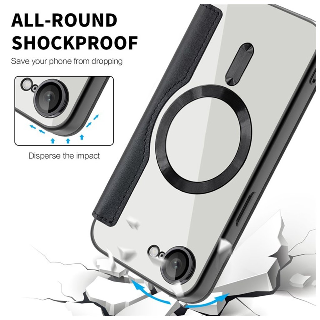 Puzdro Techsuit SmartMag Book Case sa pýši premysleným dizajnom, ktorý kombinuje estetiku s praktickosťou. Vonkajšia strana je vyrobená z prémiovej syntetickej kože v klasickej čiernej farbe, ktorá dodáva puzdru luxusný vzhľad a príjemný pocit na dotyk. Vnútorná strana, ktorá drží telefón, je priehľadná, čo umožňuje vyniknúť originálnemu dizajnu vášho iPhone 16e, vrátane ikonického loga Apple a MagSafe kruhu.