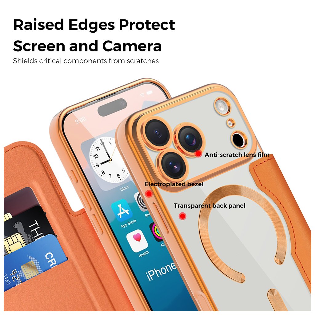 - Odolný TPU materiál: Vnútorný transparentný zadný kryt, ktorý drží telefón, je vyrobený z odolného TPU materiálu s galvanizovaným rámčekom v farbe ružového zlata, ktorý elegantne dopĺňa oranžový odtieň puzdra.