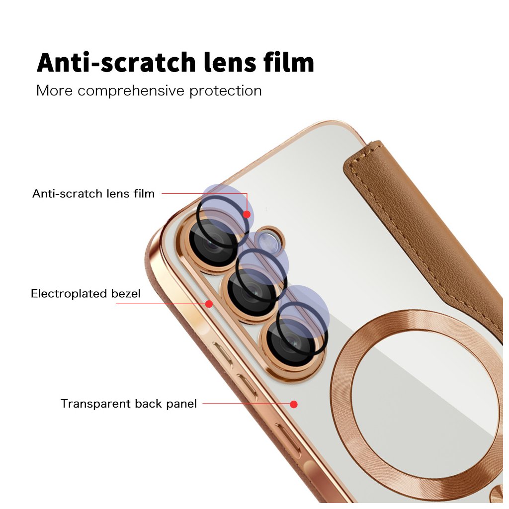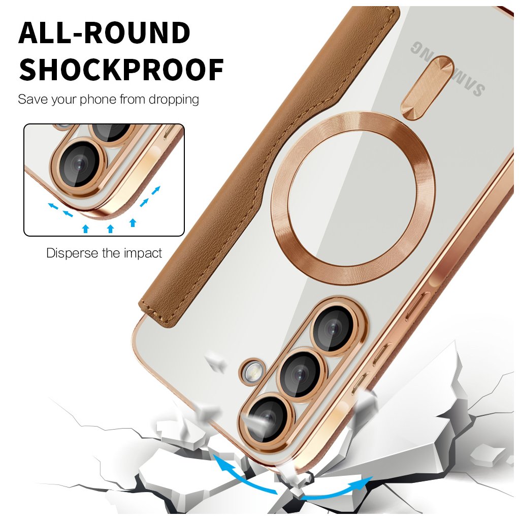 - Telefón je bezpečne usadený v priehľadnej vaničke s elegantnými ružovo-zlatými/medenými okrajmi a zvýraznenými krúžkami okolo fotoaparátov, ktoré dodávajú puzdru luxusný nádych.