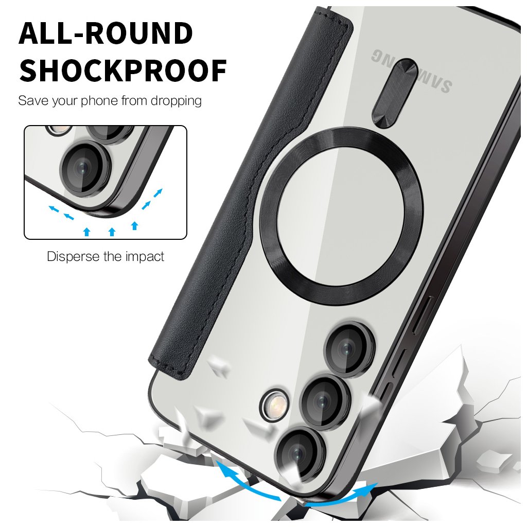 Zadná časť puzdra je tvorená transparentným panelom, ktorý nechá vyniknúť originálny dizajn vášho Samsung Galaxy S24. Dominantným prvkom je integrovaný magnetický kruh, ktorý zaisťuje kompatibilitu s bezdrôtovým nabíjaním a MagSafe príslušenstvom, čo vám umožní pohodlne používať telefón aj počas nabíjania. Okolo fotoaparátu nájdete zosilnený galvanizovaný rámček a špeciálnu fóliu proti poškriabaniu objektívov, čo zaručuje maximálne bezpečie pre vaše cenné šošovky. Puzdro je navrhnuté tak, aby rozptyľovalo nárazy a poskytovalo celoobvodovú ochranu proti pádům.