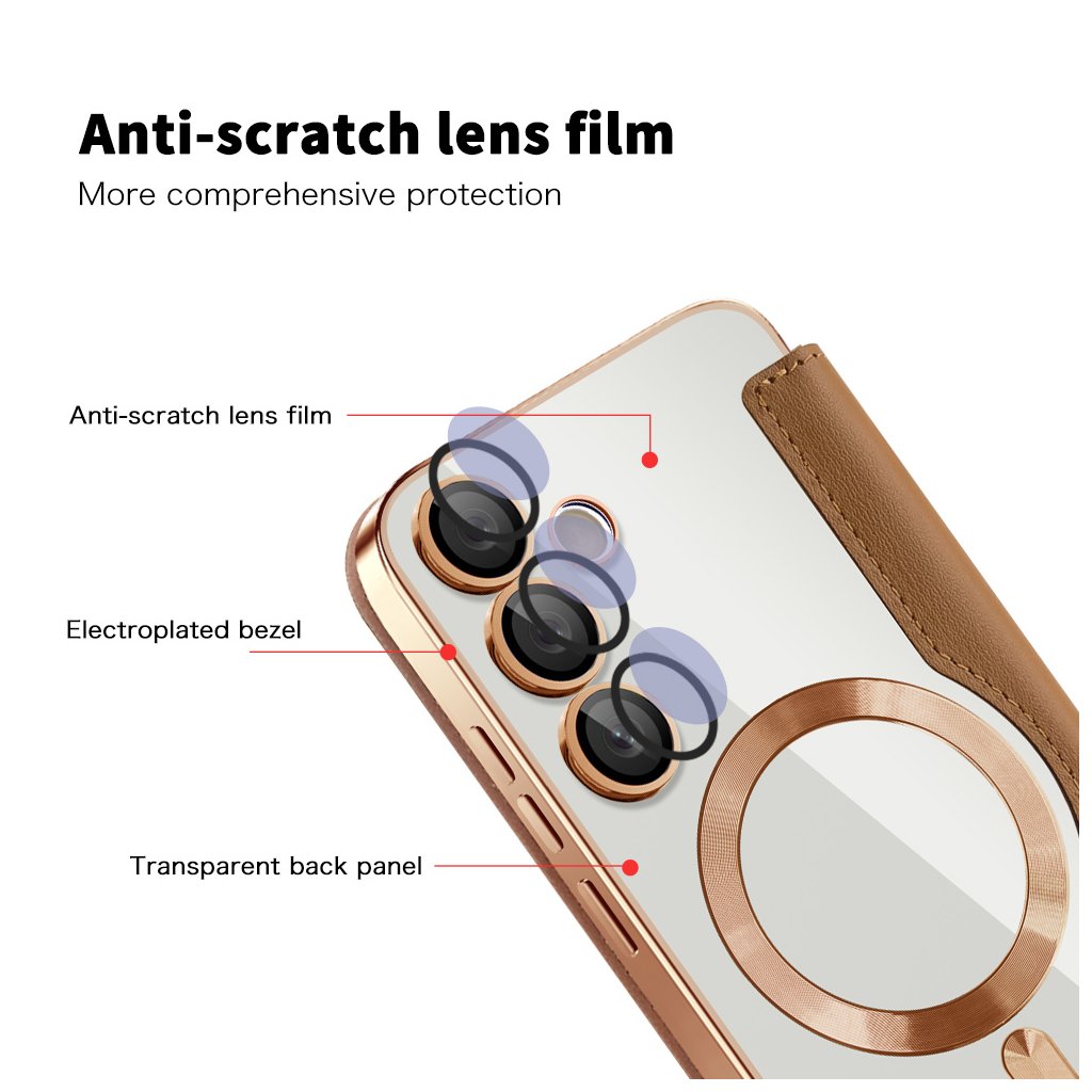 Zadná strana puzdra zaujme transparentným panelom, ktorý nechá vyniknúť originálny dizajn vášho Samsung Galaxy S24 Plus. Okraje telefónu a moduly fotoaparátu sú elegantne lemované galvanizovaným rámčekom v farbe ružového zlata, čo dodáva puzdru punc exkluzivity. Pre komplexnú ochranu fotoaparátu je integrovaná fólia proti poškriabaniu objektívu, ktorá chráni šošovky pred poškodením.