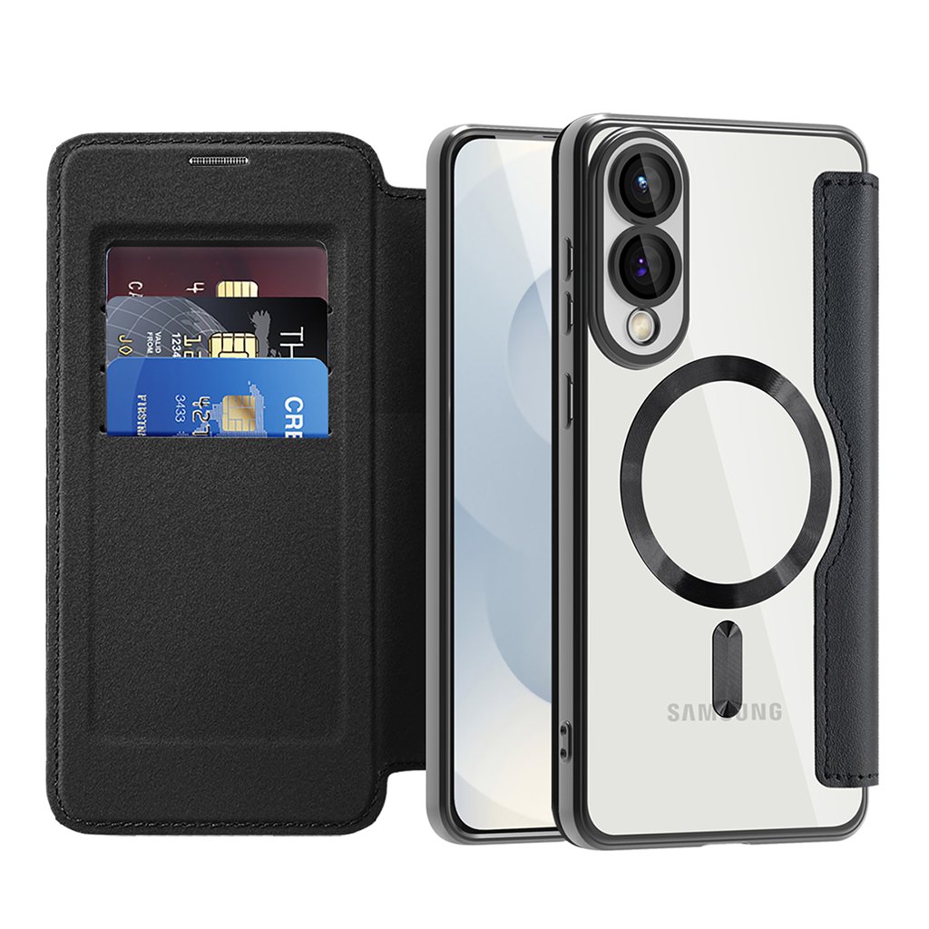 Puzdro Techsuit SmartMag sa pýši elegantným knižným dizajnom v klasickej čiernej farbe, ktorý dodá vášmu zariadeniu profesionálny vzhľad. Predný odklápací kryt je vyrobený z prémiovej syntetickej kože, ktorá je príjemná na dotyk a zároveň odolná proti opotrebovaniu. Zadná časť puzdra je transparentná, čo umožňuje vyniknúť originálnemu dizajnu a farbe vášho Samsung Galaxy S25 Edge.