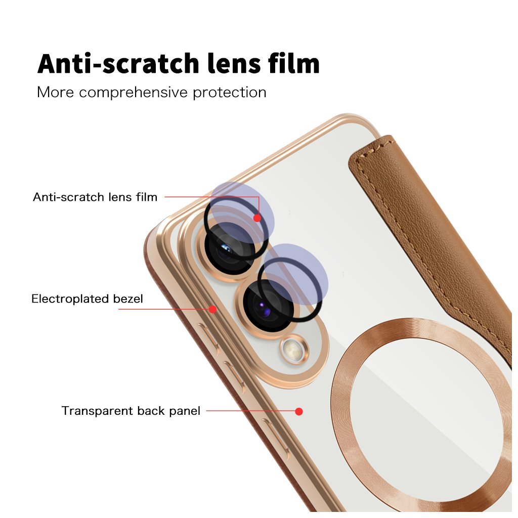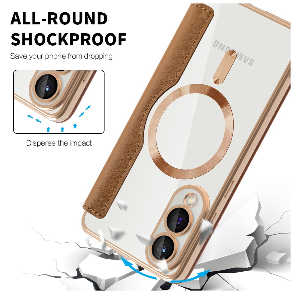 - Telefon je bezpečne usadený v priehľadnej vaničke s elegantným rámčekom v farbe ružového zlata, ktorý dokonale ladí s hnedým exteriérom.