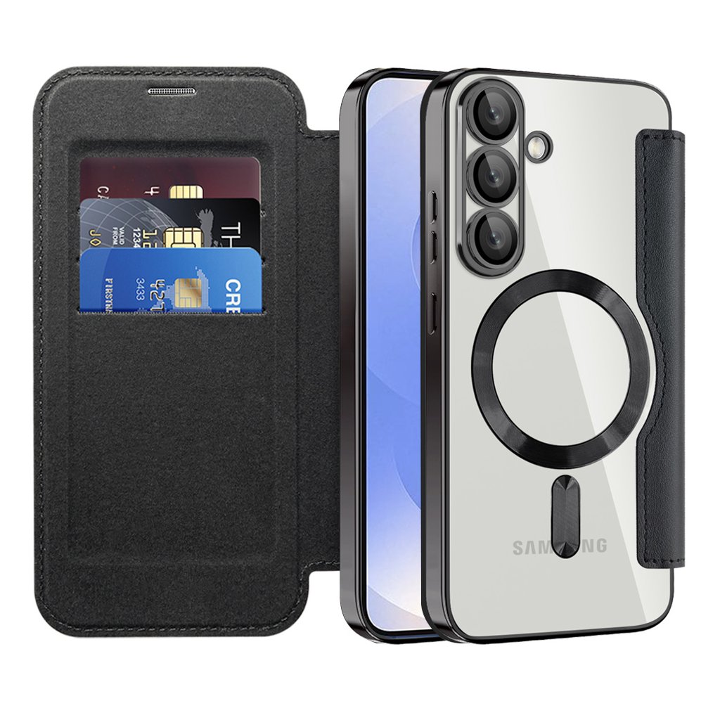 Puzdro Techsuit SmartMag sa pýši minimalistickým a zároveň vysoko praktickým dizajnom. Vonkajšia strana je vyrobená z odolného materiálu s jemnou textúrou v matne čiernej farbe, ktorá dodáva puzdru luxusný vzhľad a príjemný pocit na dotyk. Vnútorná strana prednej klapky je vybavená praktickými slotmi pre dve karty a väčšou kapsou, ideálnou pre bankovky alebo ďalšie doklady, čo z neho robí perfektného spoločníka pre každodenné nosenie.