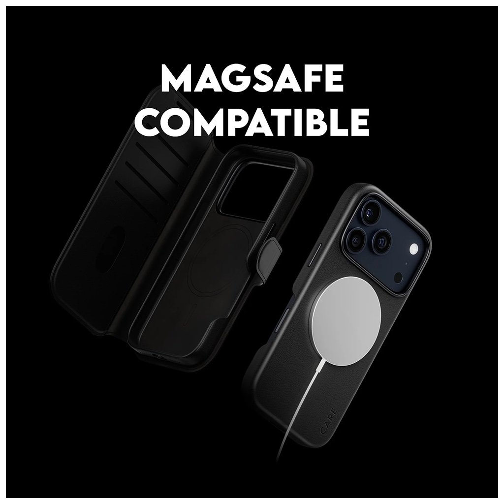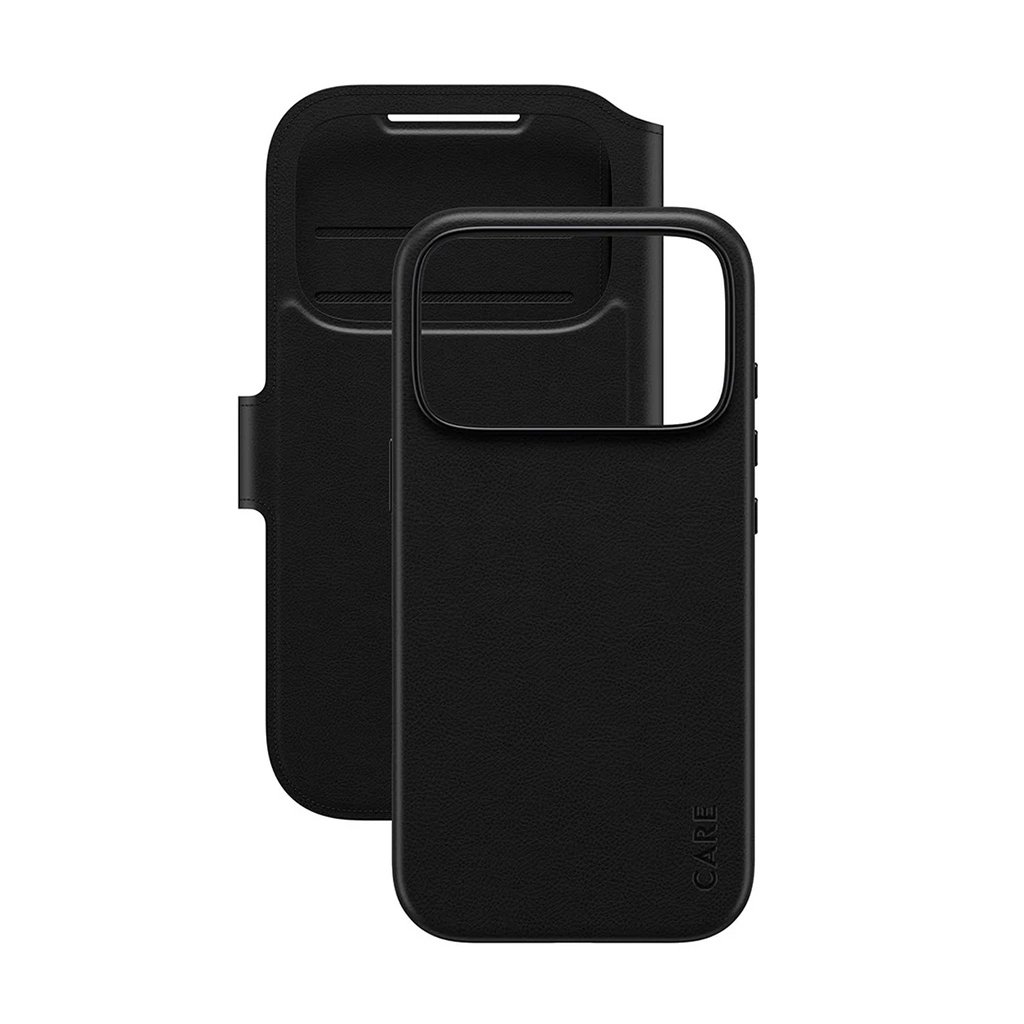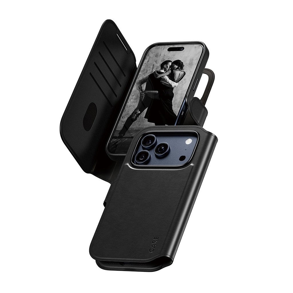 Kľúčovou vlastnosťou je jeho inovatívny dizajn "Two-in-One", ktorý umožňuje jednoduché oddelenie vnútorného zadného krytu od vonkajšieho folio puzdra. Zadný kryt je navrhnutý s ohľadom na MagSafe kompatibilitu, čo zaisťuje bezproblémové pripojenie k MagSafe príslušenstvu a rýchle bezdrôtové nabíjanie. Na zadnej strane vnútorného krytu je decentne vyrazené logo "CARE", ktoré podčiarkuje záväzok značky k udržateľnosti a kvalite. Presné výrezy pre fotoaparát a porty zaručujú plnú funkčnosť telefónu bez nutnosti vyberania z puzdra.