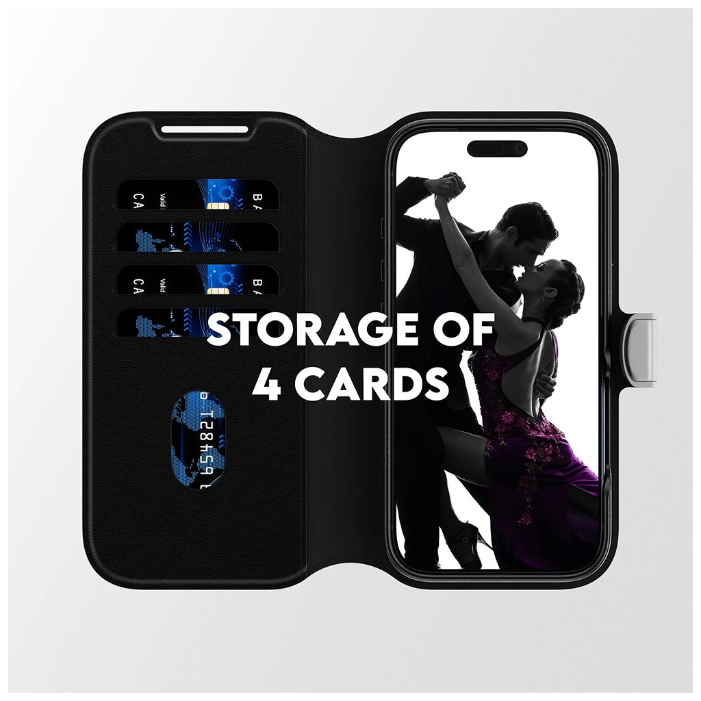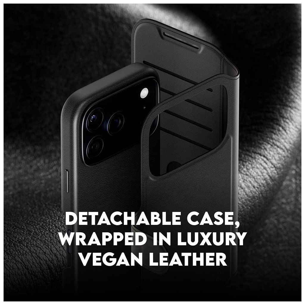 Puzdro PanzerGlass® CARE MagSafe Tango Two-in-One Wallet v elegantnej čiernej farbe predstavuje dokonalú kombináciu ochrany a praktickosti. Jeho dizajn sa vyznačuje minimalistickým a sofistikovaným vzhľadom s jemnou textúrou, ktorá pripomína kožu a dodáva puzdru prémiový pocit. Jedná sa o folio puzdro, ktoré obopína celý telefón a chráni ho zo všetkých strán. Vnútorná strana odklápacej časti je vybavená praktickými priehradkami na karty, čo z neho robí ideálneho spoločníka pre každodenné nosenie.
