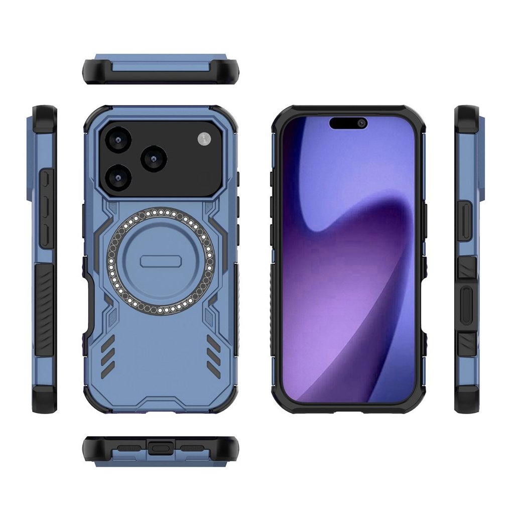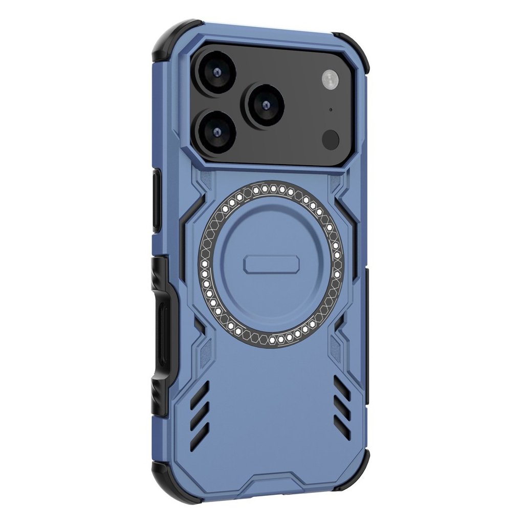 Puzdro Techsuit ArmorMag pre iPhone 17 Pro v elegantnej modrej farbe sa vyznačuje robustným a zároveň štýlovým dizajnom. Jeho konštrukcia kombinuje odolné materiály, ktoré poskytujú zvýšenú ochranu proti pádom a nárazom. Zadná strana puzdra je opatrená integrovaným magnetickým krúžkom, ktorý je lemovaný drobnými, lesklými prvkami, čo zaisťuje kompatibilitu s MagSafe príslušenstvom a dodáva puzdru moderný vzhľad.