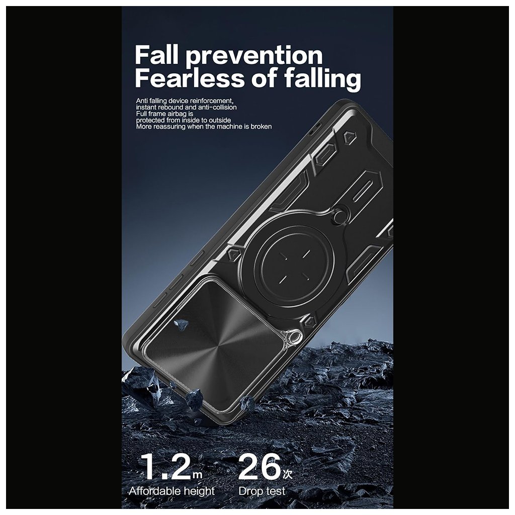- Ochrana fotoaparátu: Puzdro disponuje integrovaným posuvným krytom s elegantnou textúrou brúseného kovu, ktorý chráni šošovky pred poškriabaním a nečistotami.