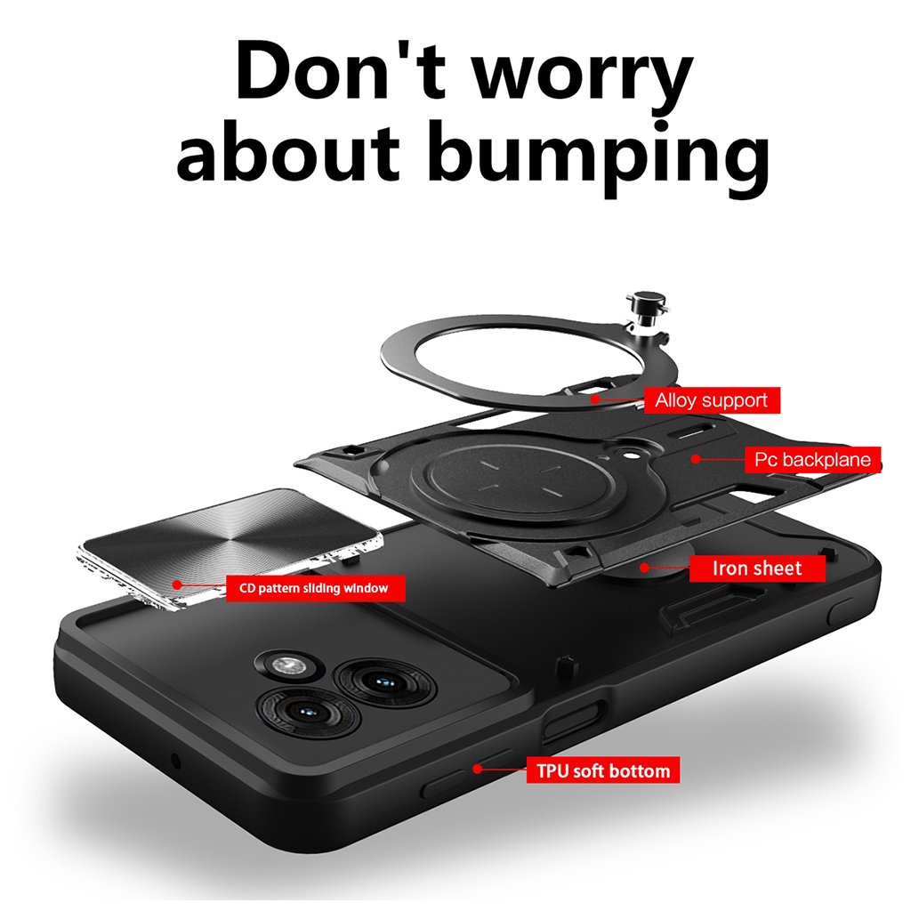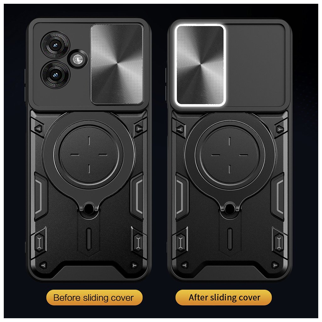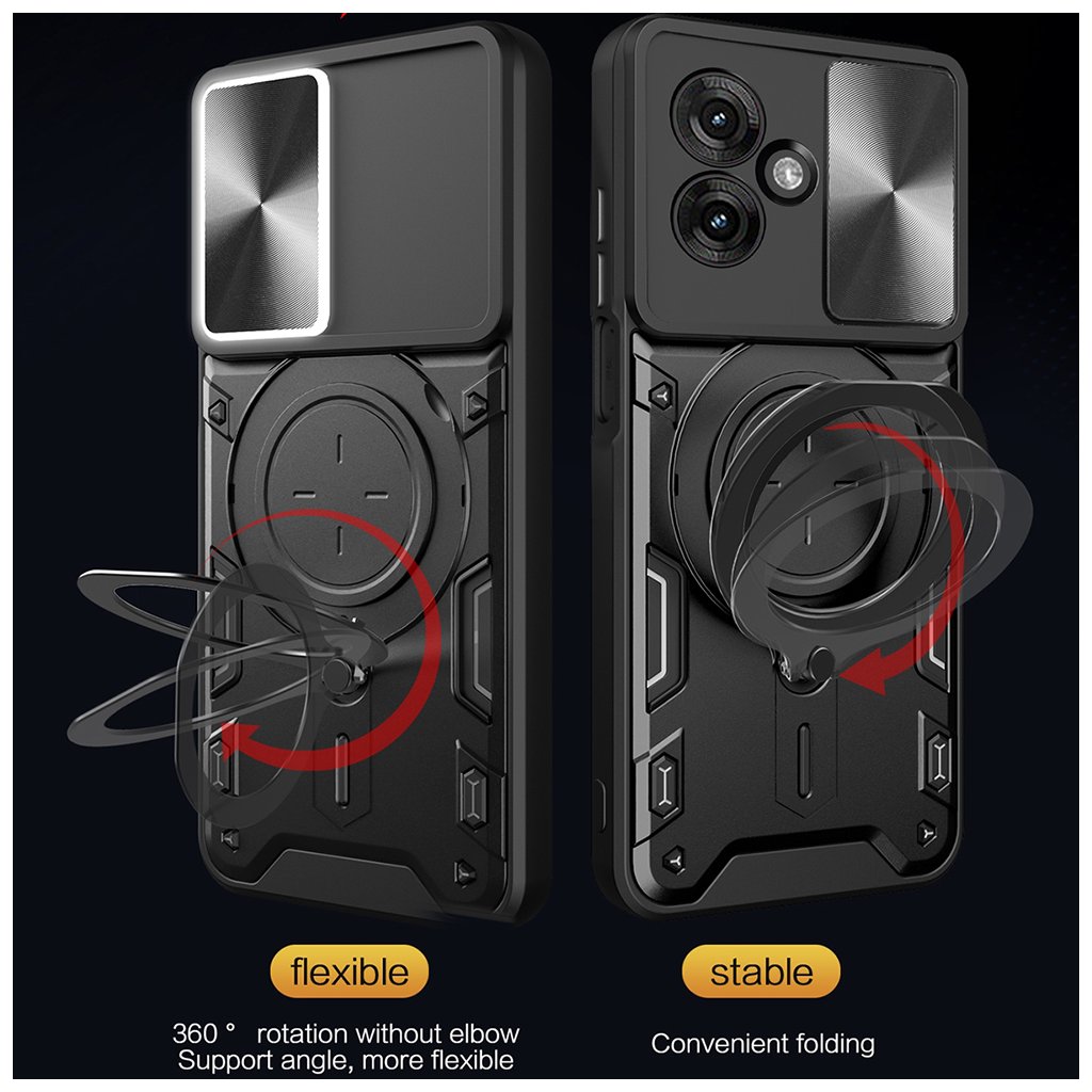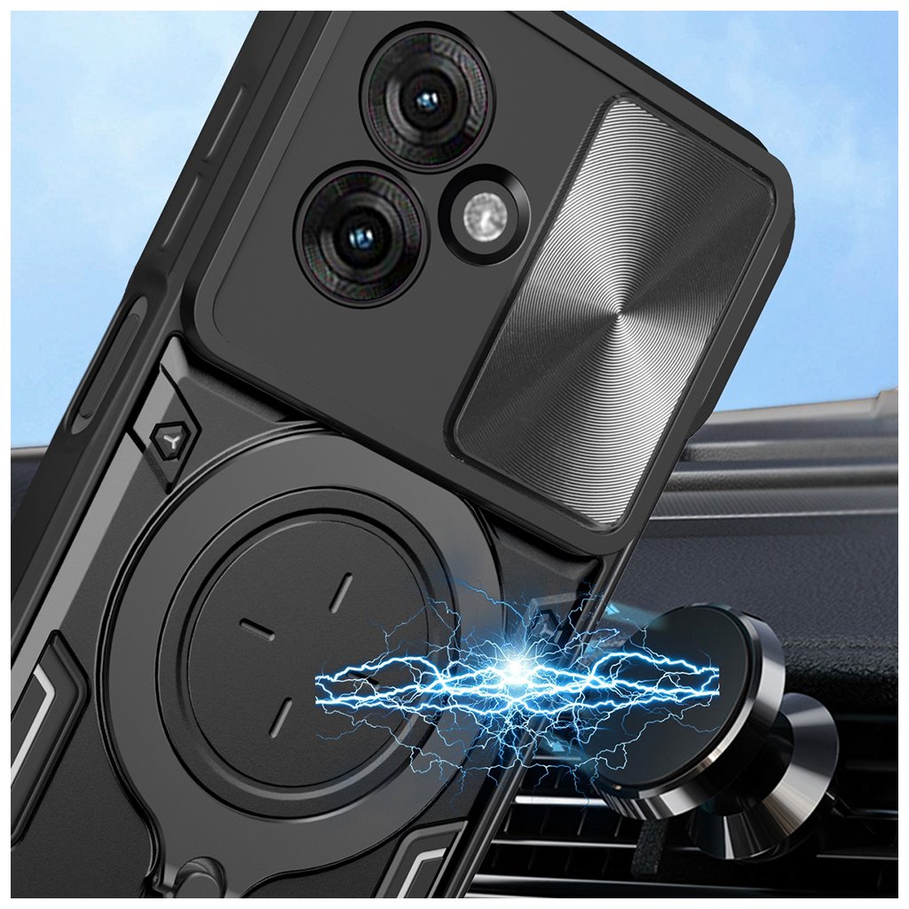Puzdro Techsuit CamGuard Pro sa pýši robustným a moderným dizajnom, ktorý kombinuje sýto modré prvky s matnými čiernymi akcentmi. Jeho dvojvrstvová konštrukcia zaisťuje vysokú odolnosť, zatiaľ čo precízne spracovanie zaručuje dokonalé padnutie na váš telefón. Integrovaný posuvný kryt efektívne chráni šošovky fotoaparátu pred poškriabaním a nečistotami, zatiaľ čo multifunkčný kovový krúžok slúži ako praktický stojanček alebo bezpečný úchyt.