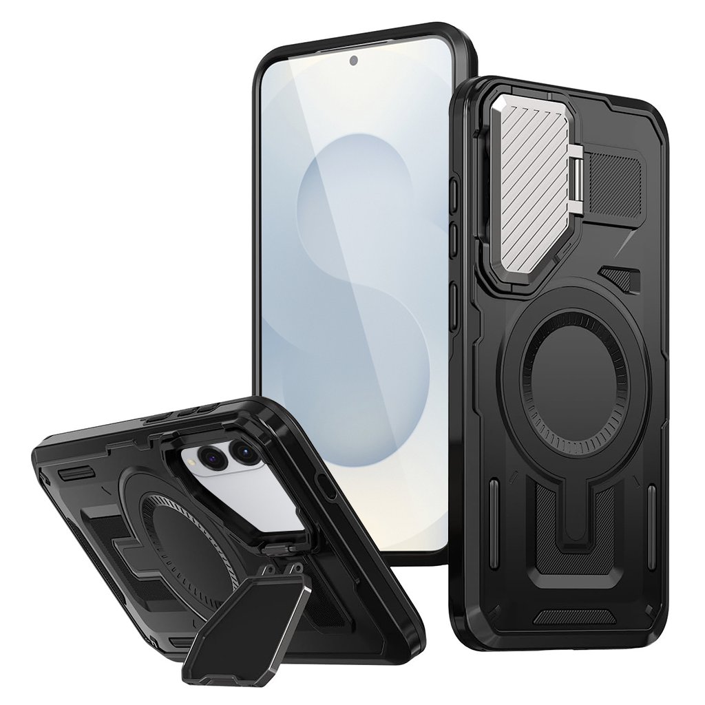 Toto robustné puzdro sa pýši moderným a odolným dizajnom v elegantnej čiernej farbe. Jeho konštrukcia je navrhnutá pre maximálnu ochranu, s výraznými detailmi, ktoré podčiarkujú jeho pevnosť. Dominantou zadnej strany je inovativný posuvný kryt fotoaparátu s textúrovaným povrchom, ktorý spoľahlivo chráni objektívy pred poškriabaním a nečistotami, keď ho nepoužívate.