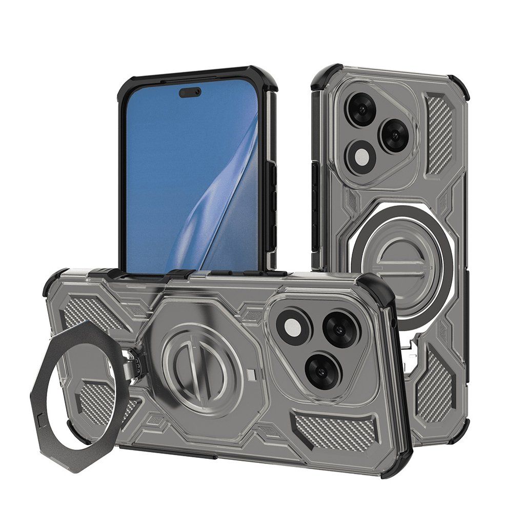 - Integrovaný krúžok a magnetický držiak: Na zadnej strane puzdra je umiestnený praktický otočný krúžok, ktorý slúži ako stojanček pre pohodlné sledovanie obsahu alebo ako bezpečný úchyt pre prst. Uprostred krúžku sa nachádza integrovaný magnetický prvok, ktorý umožňuje jednoduché pripevnenie k magnetickým držiakom v aute či na stole.