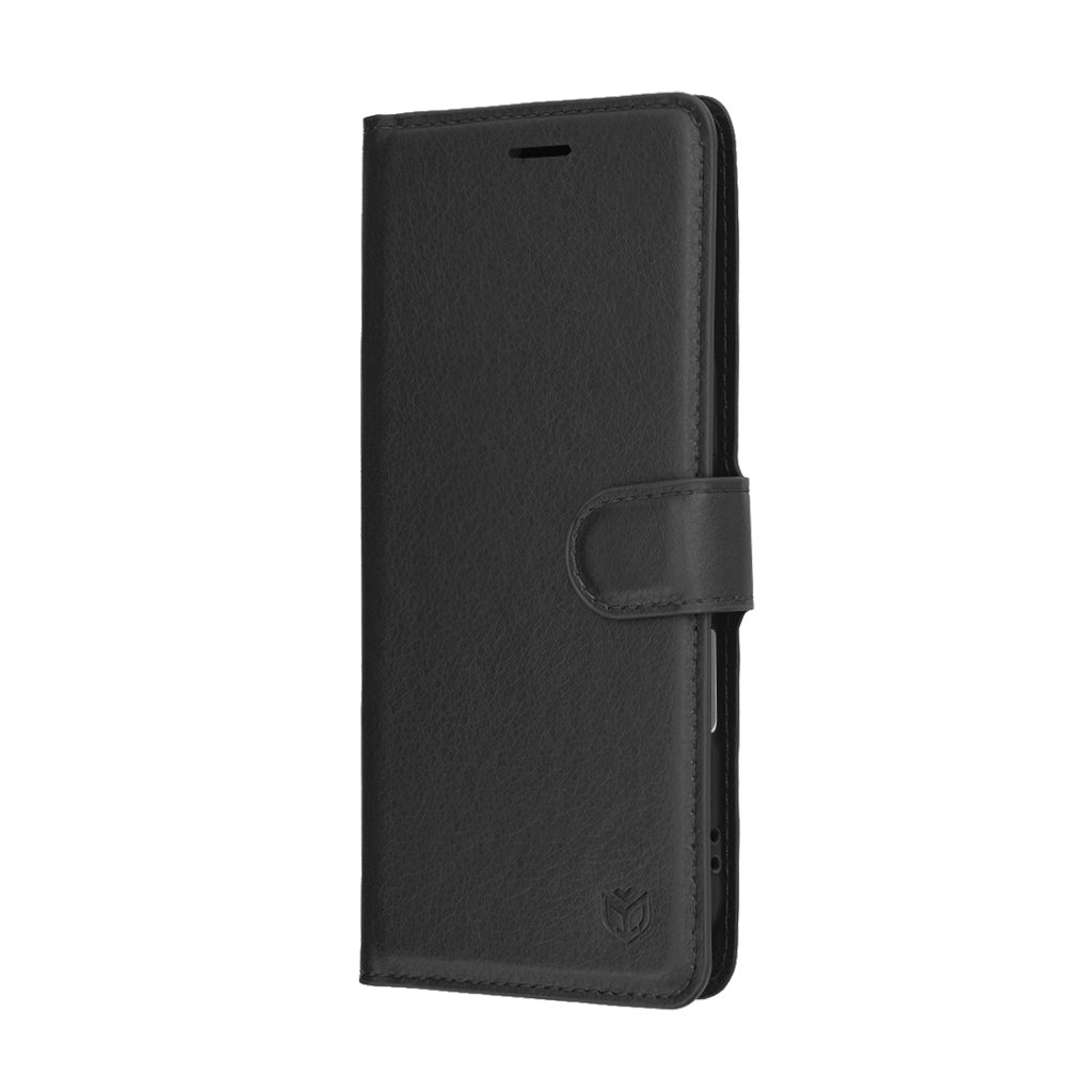 Puzdro Techsuit Leather Folio sa pýši klasickým folio dizajnom, ktorý chráni telefón zo všetkých strán. Jeho povrch je vyvedený v prémiovej čiernej farbe s jemnou textúrou imitujúcou kožu, čo dodáva puzdru luxusný a nadčasový vzhľad. Integrovaná magnetická spona zaisťuje bezpečné uzavretie a chráni displej pred poškriabaním a nečistotami.