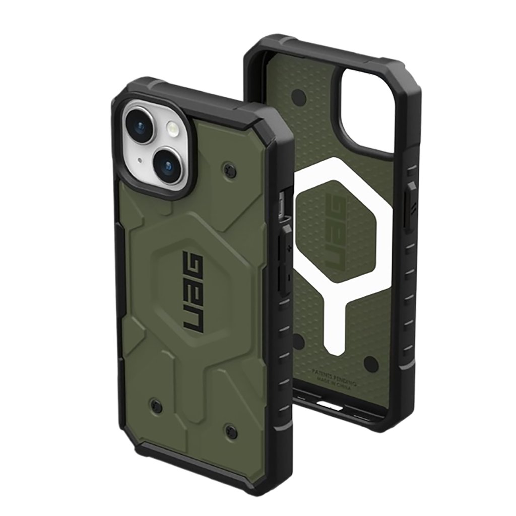 Dizajn puzdra UAG Pathfinder MagSafe je okamžite rozpoznateľný vďaka svojmu robustnému a industriálnemu vzhľadu. Olivovo zelená farba s čiernymi akcentmi dodáva puzdru vojenský, avšak štýlový nádych. Zadná strana je opatrená charakteristickým geometrickým vzorom a výrazným šesťhranným logom UAG, ktoré podčiarkuje jeho drsný charakter.