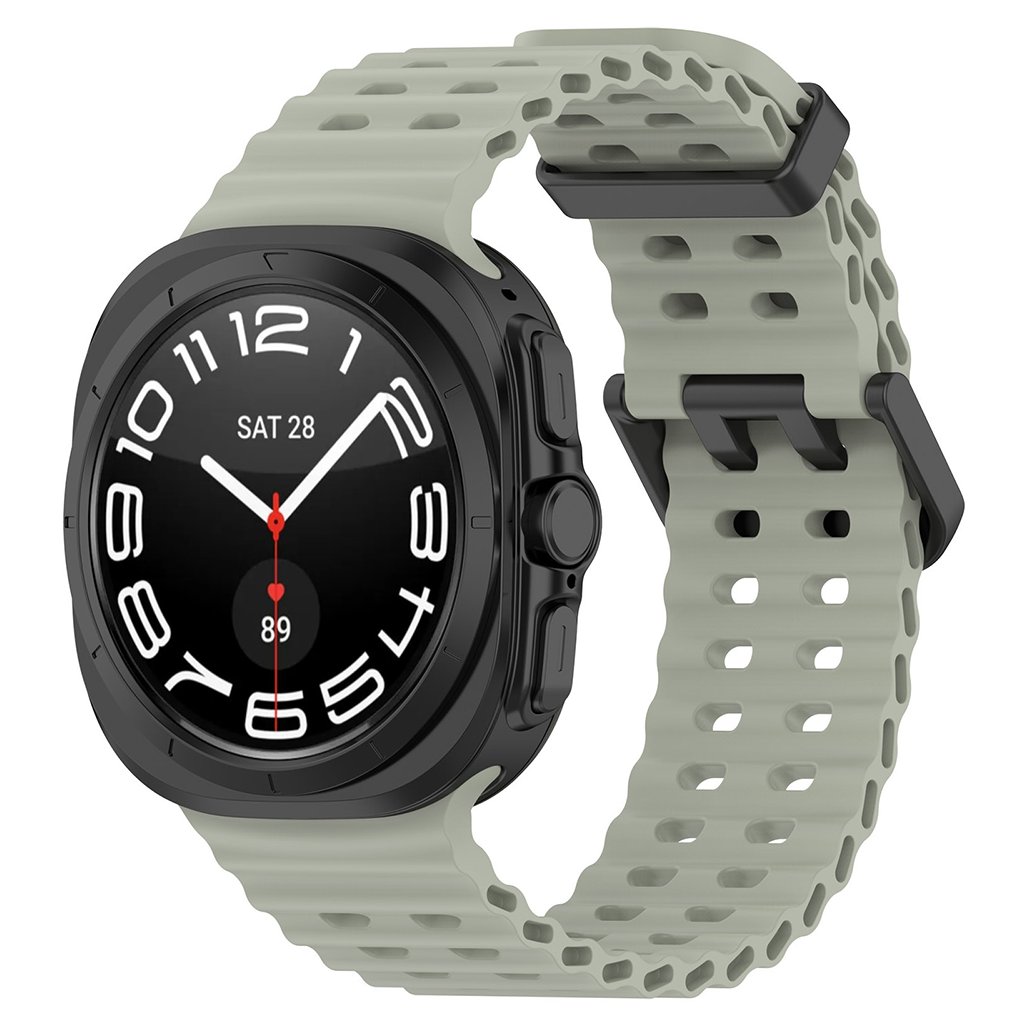 Remienok Techsuit pre Samsung Galaxy Watch Ultra 47mm Light Green Doprajte svojim inteligentným hodinkám Samsung Galaxy Watch Ultra 47mm nový, svieži vzhľad s elegantným a funkčným remienkom Techsuit v odtieni Light Green. Tento remienok je navrhnutý tak, aby dokonale doplnil váš aktívny životný štýl a zároveň zaistil maximálne pohodlie a odolnosť. Dizajn a materiály Remienok je vyrobený z vysokokvalitného silikónu, ktorý je príjemný na dotyk, odolný voči potu a vode a ľahko sa udržiava. Jeho dizajn sa vyznačuje športovou eleganciou s výraznou vlnitou textúrou a perforovaným povrchom, ktorý zaisťuje vynikajúcu priedušnosť a komfort aj pri dlhodobom nosení či intenzívnom športe. Svetlozelená farba dodáva hodinkám moderný a dynamický vzhľad. Remienok je vybavený robustnou čiernou prackou, ktorá zaručuje bezpečné a spoľahlivé uchytenie na zápästí. Parametre produktu- Materiál: Vysokokvalitný silikón