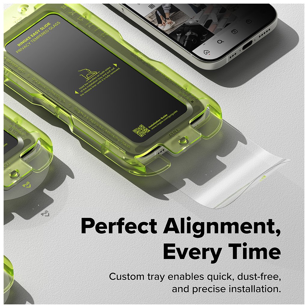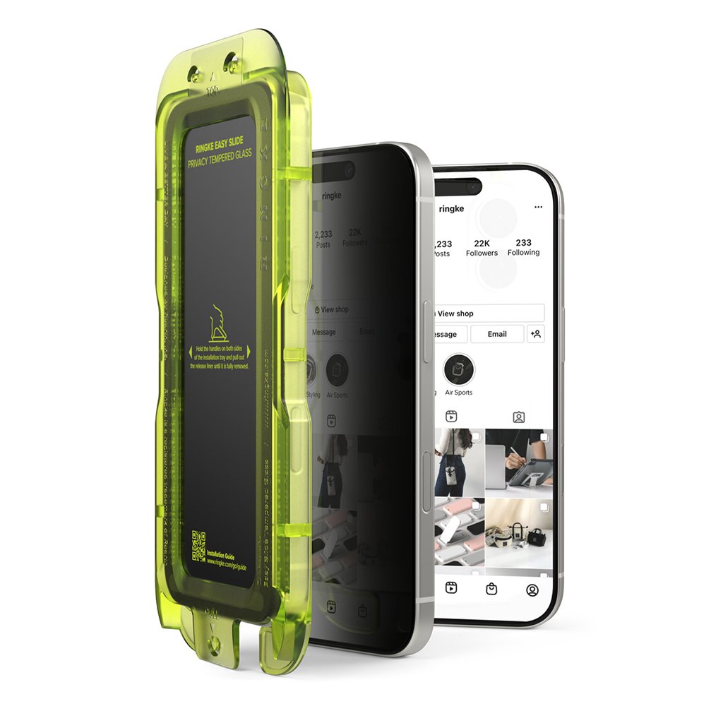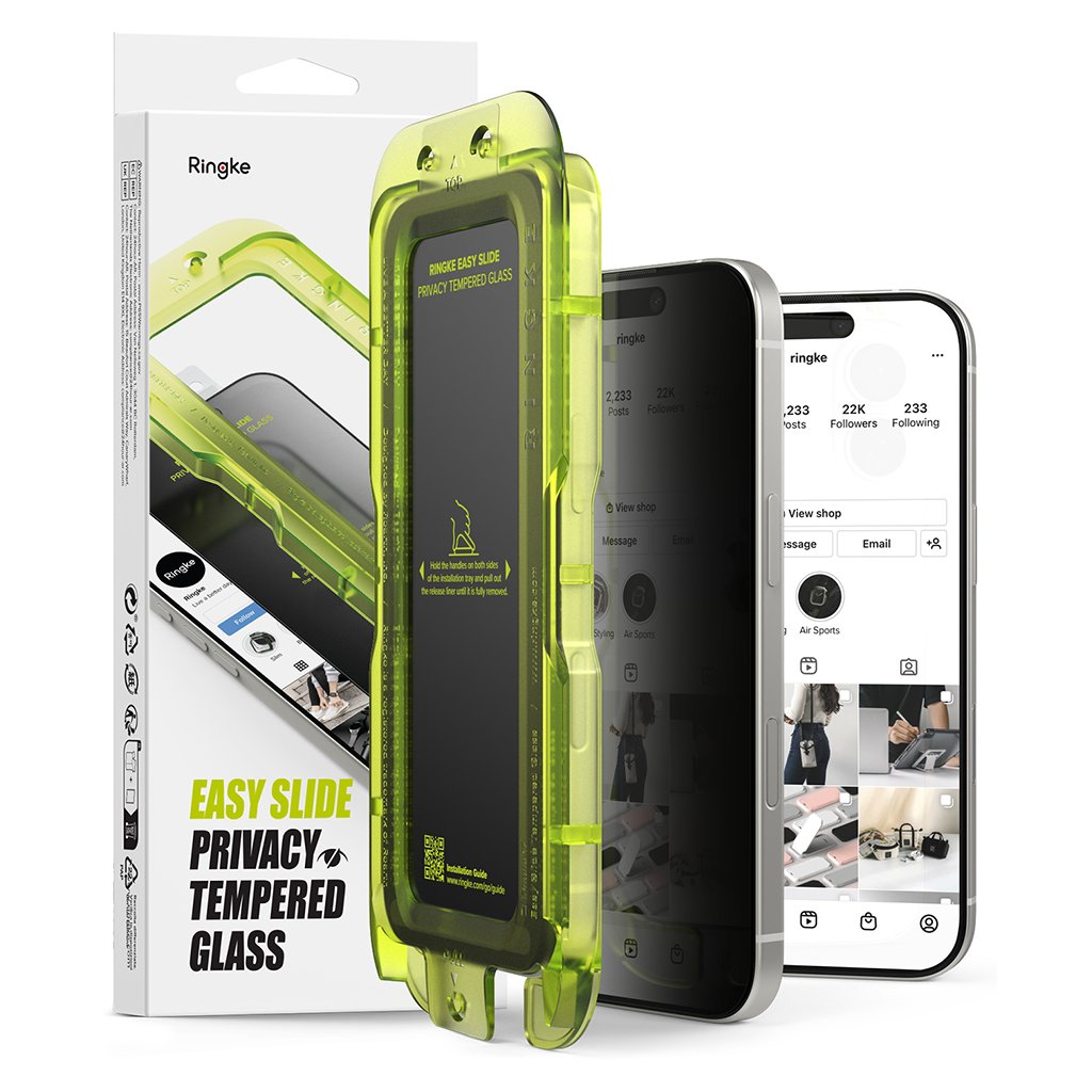 * **Ochrana súkromia:** Inovatívna technológia blokuje periférny pohľad na displej z uhla 28 stupňov a viac, čím zabezpečuje úplnú nečitateľnosť obsahu z uhla 35 stupňov. Vaše citlivé informácie tak zostanú skryté pred zvedavými pohľadmi. * **Jednoduchá inštalácia:** Súčasťou balenia je **inovativný inštalačný rámček** v žiarivo zelenej farbe, ktorý zaručuje **ľahkú, rýchlu a bezprašnú aplikáciu** s dokonalým zarovnaním zakaždým. Inštalácia skla je hračka aj pre neskúsených používateľov. * **Oleofóbna vrstva:** Sklo je vybavené špeciálnou oleofóbnou vrstvou, ktorá minimalizuje odtlačky prstov a šmuhy, udržujúc displej čistý a priehľadný. * **Vysoká citlivosť dotyku:** Aj napriek robustnej ochrane si sklo zachováva **vysokú citlivosť dotyku**, takže používanie telefónu zostáva plynulé a intuitívne. * **Case Friendly dizajn:** Všetky ochranné prvky Ringke sa pýšia **dokonalým "Case Friendly" dizajnom** – sú precízne navrhnuté tak, aby boli **100% kompatibilné** s legendárnymi puzdrami Ringke (napr. série Fusion, Onyx alebo Air) a nedochádzalo k zdvíhaniu okrajov skla. * **Vysoká odolnosť:** Tvrdené sklo s tvrdosťou 9H poskytuje vynikajúcu ochranu proti poškriabaniu, nárazom a pádom.Parametre produktu: