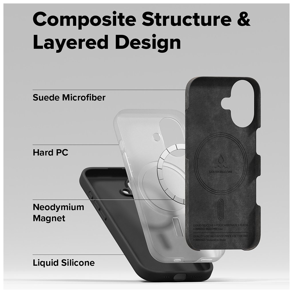 - Puzdro Ringke Silicone Magnetic MagSafe sa pýši hladkým a matným povrchom z tekutého silikónu, ktorý je príjemný na dotyk a zaisťuje pevný a istý úchop.
