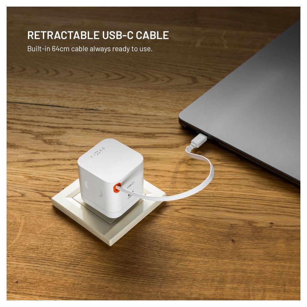 Sieťová GaN nabíjačka FIXED s 2xUSB-C podpora PD 3.0 so samonavíjacím káblom 65W biela
