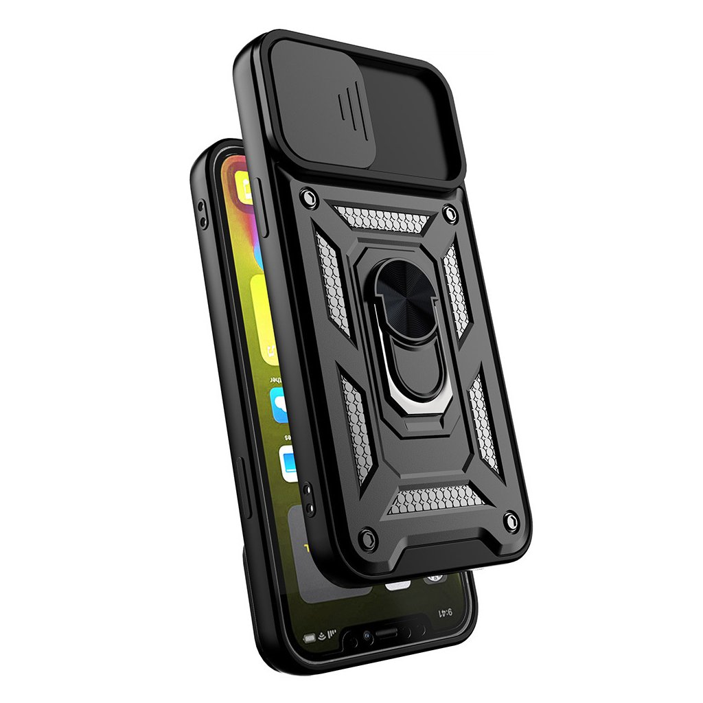 Slide Camera Armor Case - je puzdro, ktoré je ideálne do extrémnych podmienok. Puzdro chráni zadnú stranu, boky a obrazovku smartfónu. S týmto puzdrom sa o svoj telefón nemusíte báť! Ochrana proti poškriabaniu a pádu Hybridná konštrukcia - pružný TPU a tvrdý PC Zabudovaný prstenec na bezpečnejšie držanie telefónu. Funguje aj ako stojan, napr. pri sledovaní filmov alebo videohovoroch Kovová doska s magnetickými držiakmi na použitie v aute Zosilnené rohy absorbujú silu nárazu Zvýšené okraje poskytujú dodatočnú ochranu obrazovky a fotoaparátu Potrebné výrezy pre konektory, funkčné tlačidlá a fotoaparát Integrované tlačidlá zabraňujú prenikaniu prachu a nečistôt pod puzdro Protišmykový silikón zaisťuje, že telefón bezpečne padne do ruky Nabíjanie telefónu bez vybratia z puzdra Na obrázku môže byť zobrazený iný model telefónu.Dodatočné parametre