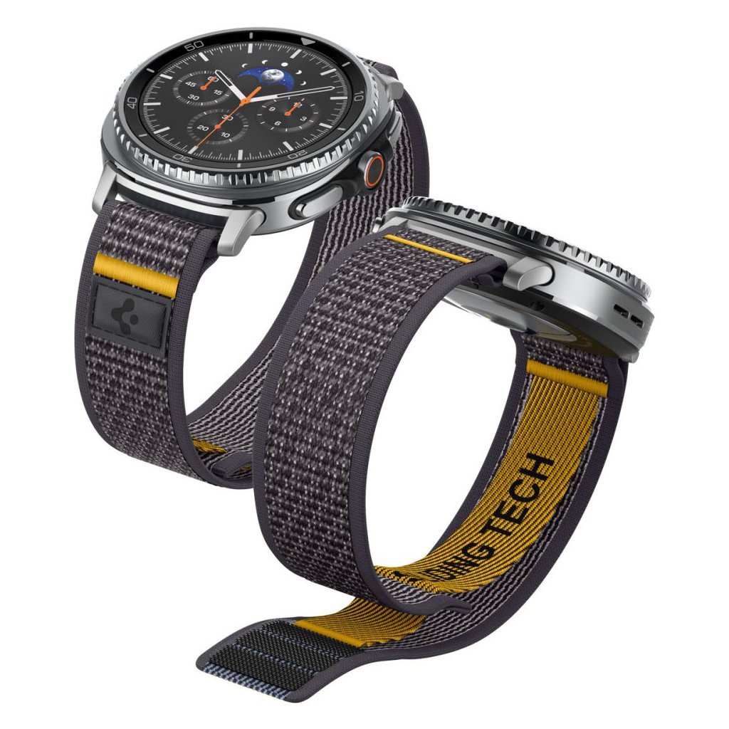 Remienok Athlex Air sa pýši sofistikovaným tkaným dizajnom v odtieni Active Gray, ktorý kombinuje tmavé a svetlejšie sivé tóny pre vytvorenie dynamického, textúrovaného vzhľadu. Jeho športový charakter podčiarkujú výrazné žlté akcenty, vrátane pútka a vnútorného nápisu "SLIDING TECH", ktoré dodávajú remienku moderný a energický nádych. Zapínanie je riešené pomocou praktického suchého zipsu, ktorý zaisťuje jednoduché nastavenie a bezpečné uchytenie na zápästí. Diskrétne čierne logo Spigen elegantne dopĺňa celkový vzhľad.