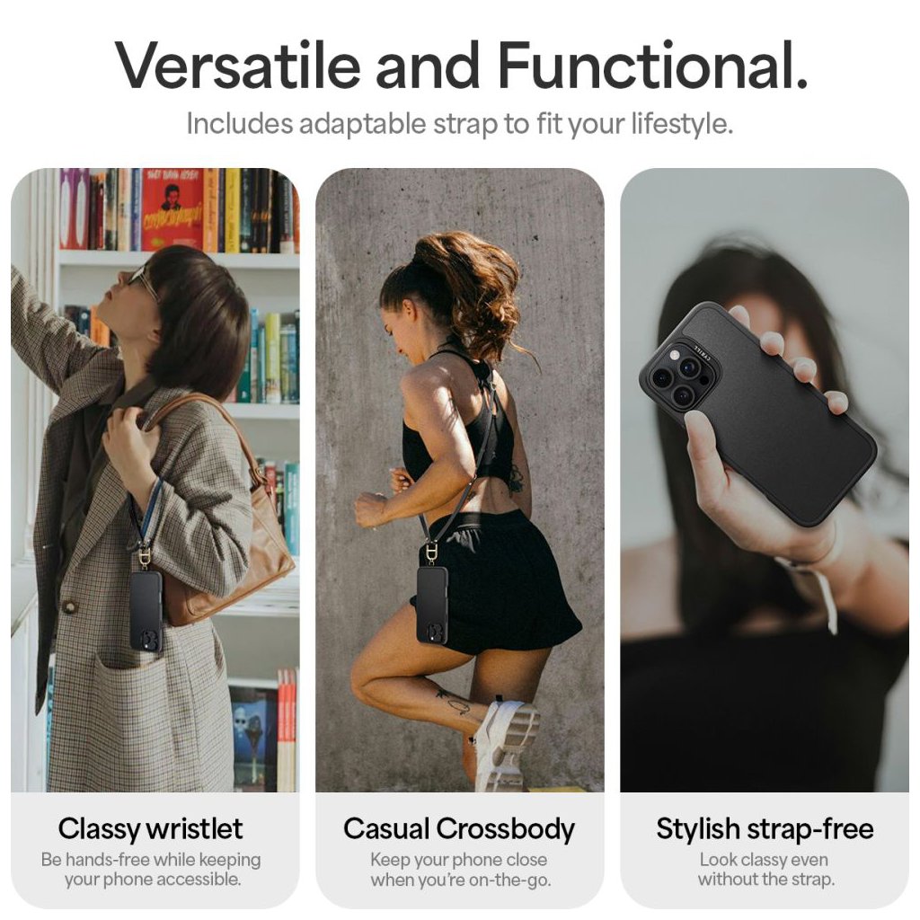 - Praktický popruh: Súčasťou balenia je čierny popruh so zlatými detailmi, ktorý umožňuje pohodlné nosenie telefónu cez rameno alebo na krku.