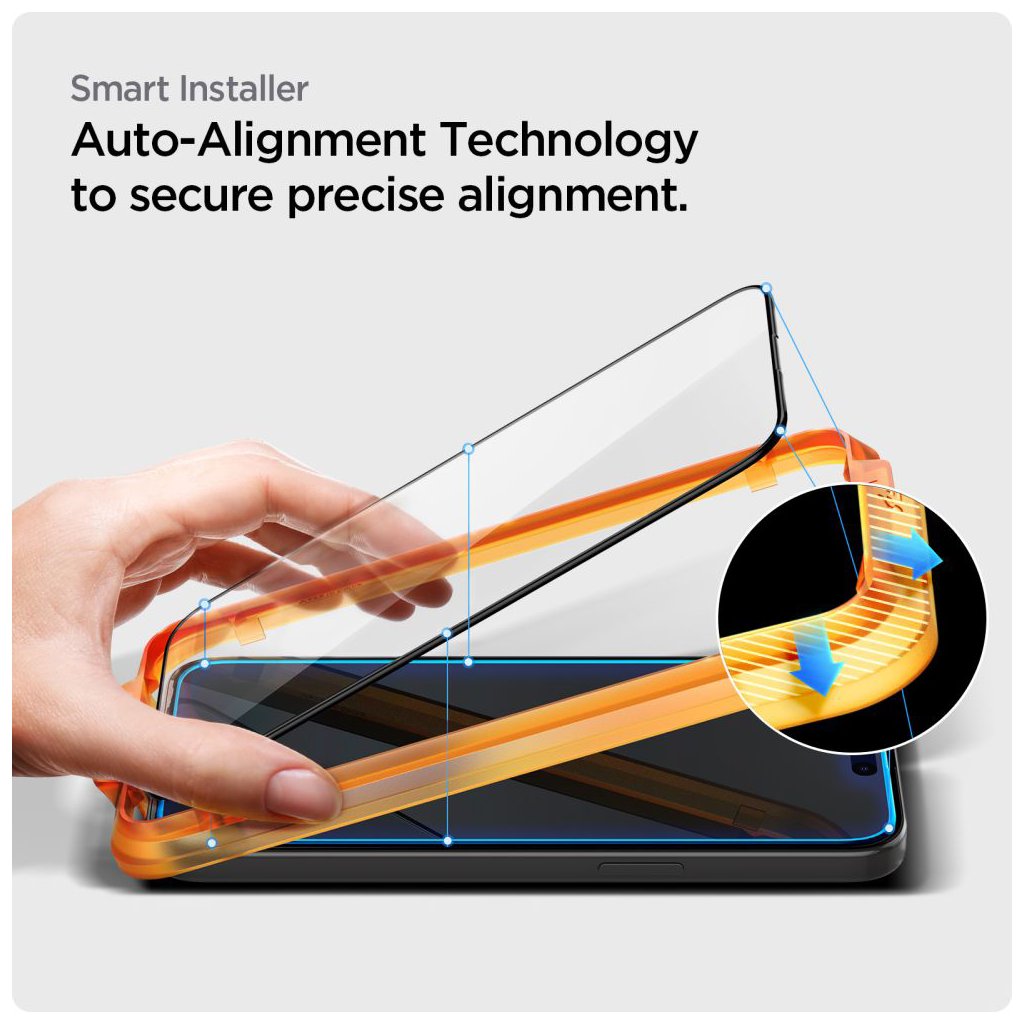 - Kľúčovým dizajnovým prvkom je inovatívny inštalačný rámček AlignMaster. Tento oranžový rámček presne obopína telefón a slúži ako precízny sprievodca pre aplikáciu skla. Zaisťuje jednoduchú, rýchlu a bezbublinkovú inštaláciu aj v domácich podmienkach, eliminujúc riziko krivého nalepenia.