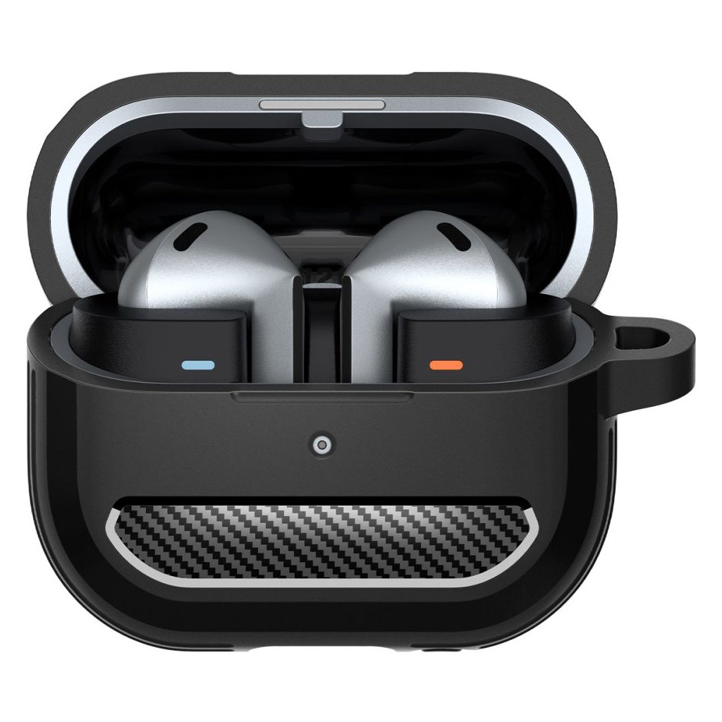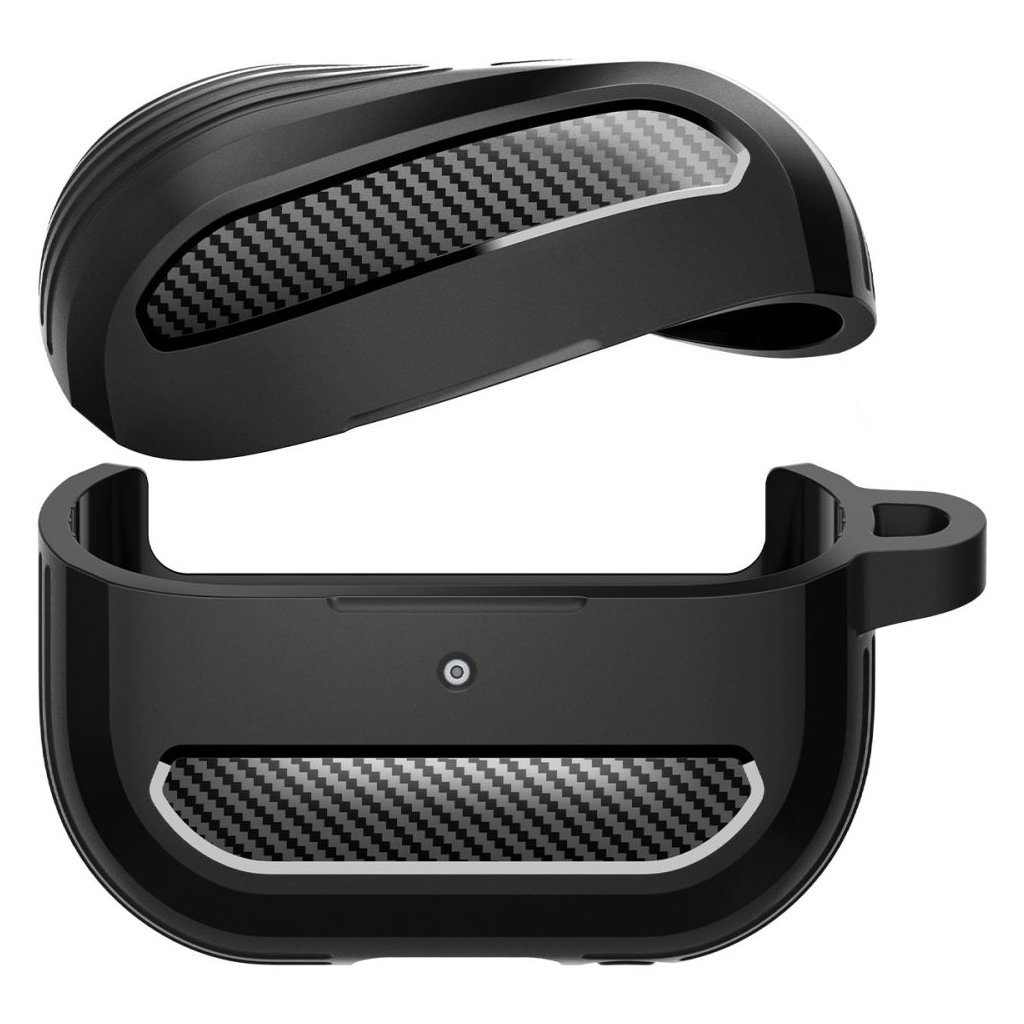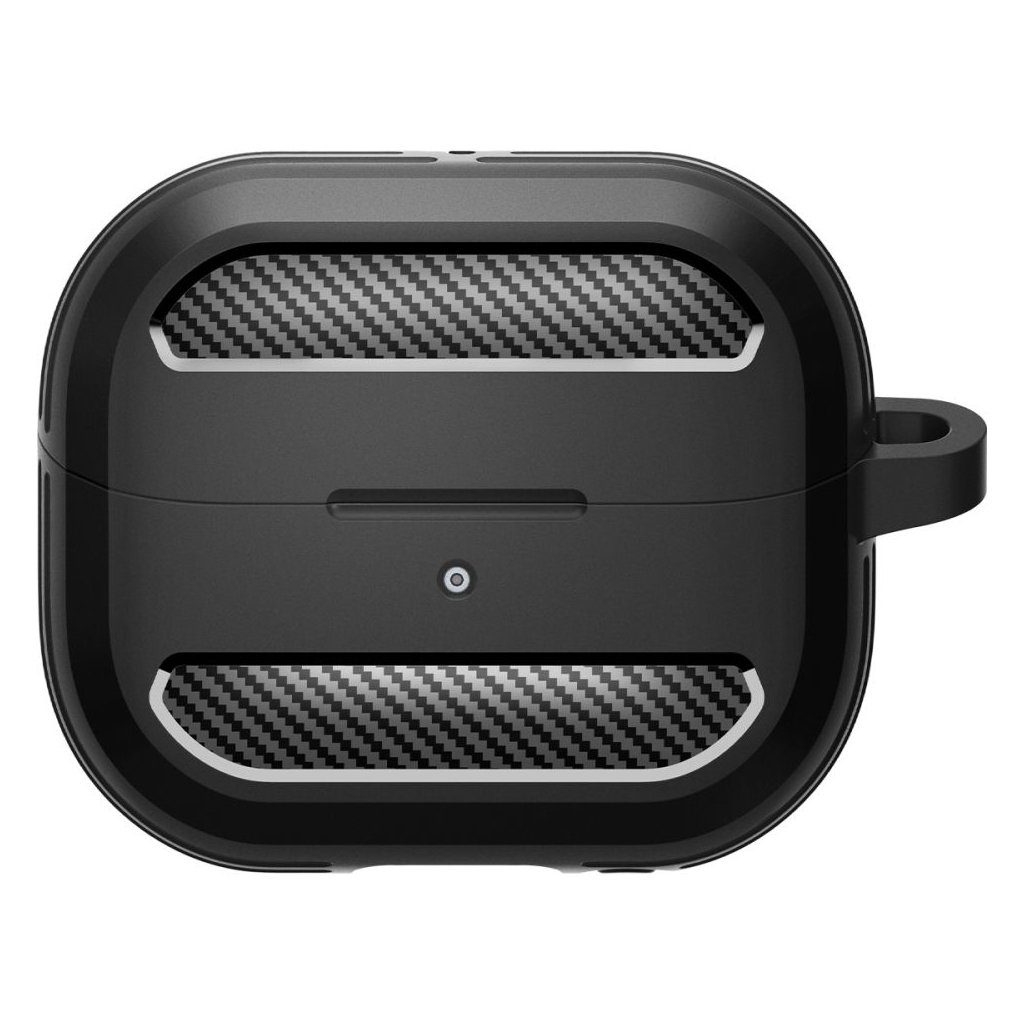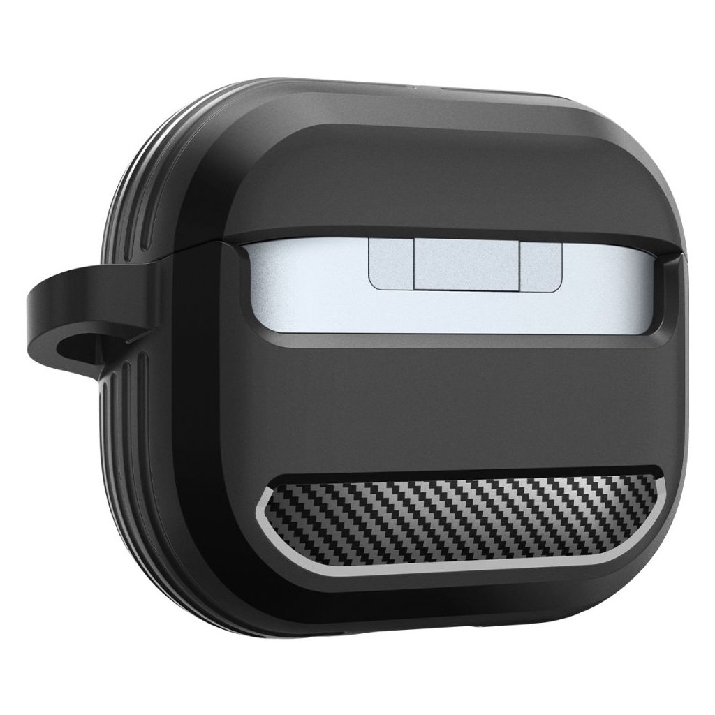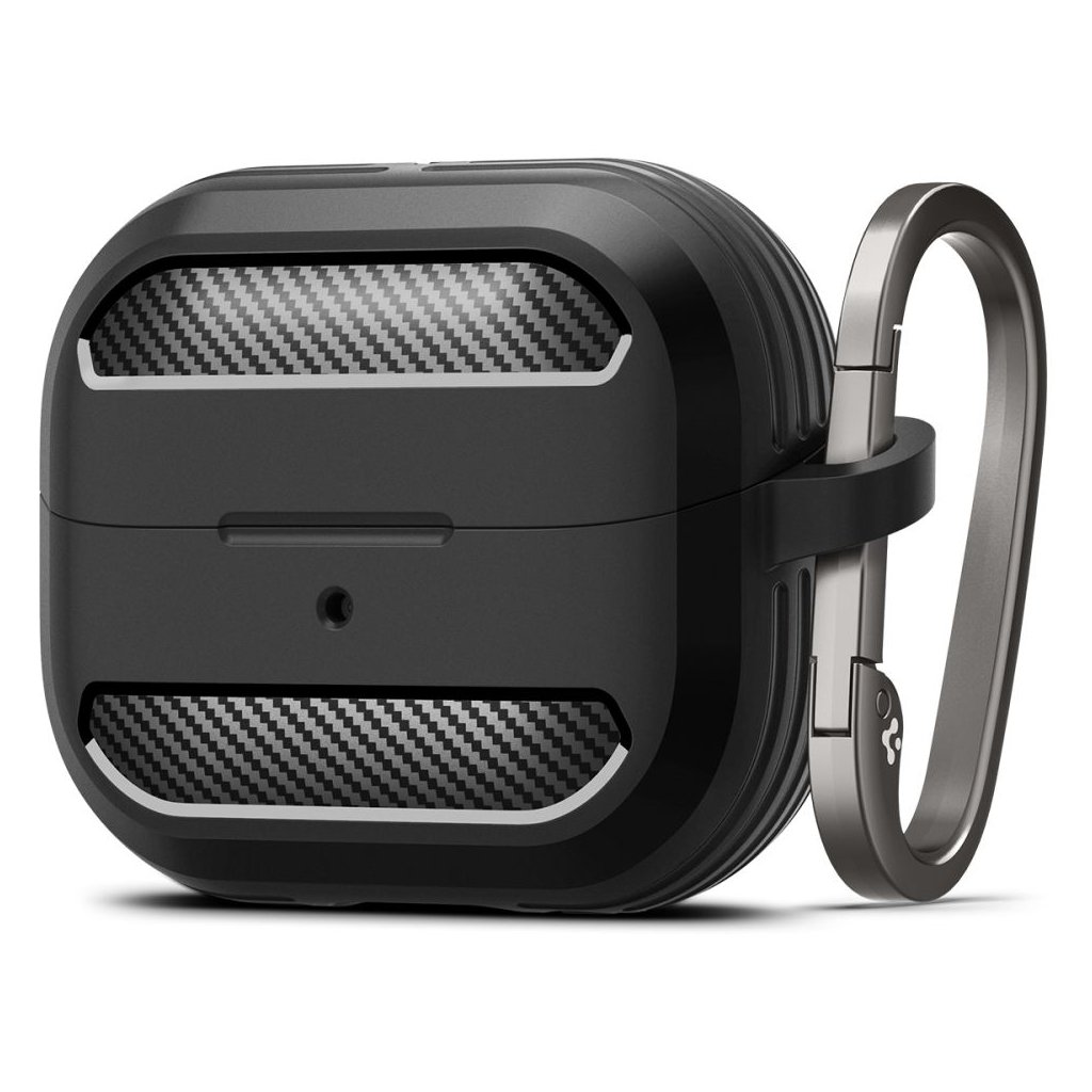 Puzdro Spigen Rugged Armor sa pýši elegantným matne čiernym prevedením, ktoré dopĺňajú štýlové akcenty s textúrou karbónových vlákien na prednej a zadnej strane. Tieto detaily dodávajú puzdru moderný a dynamický vzhľad. Bočné strany sú opatrené rebrovanými prvkami, ktoré nielenže zvyšujú estetickú hodnotu, ale taktiež zaisťujú lepší úchop a dodatočnú ochranu proti nárazom. Puzdro je vyrobené z pružného a odolného TPU materiálu, ktorý efektívne absorbuje otrasy a chráni vaše slúchadlá pred poškriabaním a pádmi. Presné výrezy zaručujú jednoduchý prístup k nabíjaciemu portu a LED indikátoru, takže nemusíte puzdro dávať dole pri nabíjaní. Súčasťou balenia je aj praktická kovová karabína, ktorá umožňuje bezpečné pripevnenie puzdra k batohu, kľúčom alebo opasku, a zaisťuje tak, že budete mať svoje slúchadlá vždy po ruke.