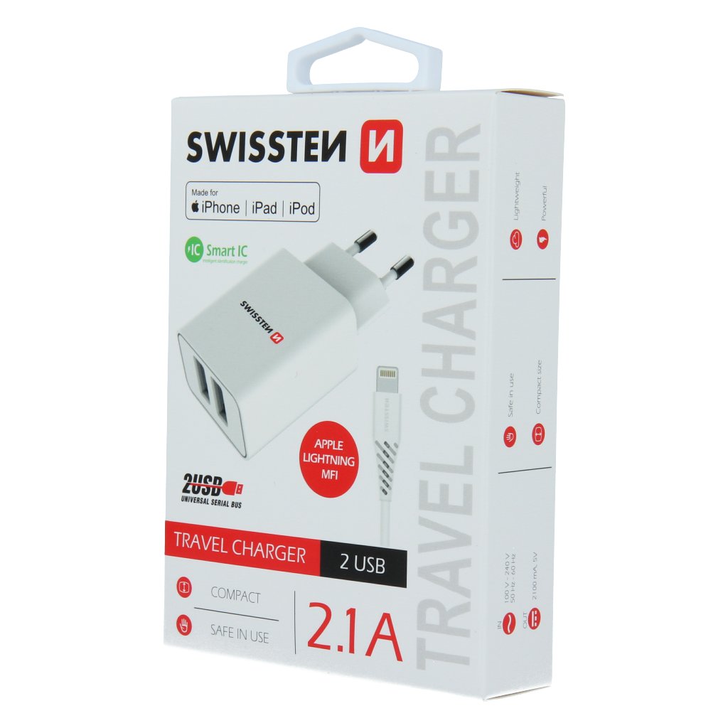 Swissten sieťový adaptér smart ic 2x usb 2.1a napájací + dátový kábel usb / lightning mfi 1,2 m biely