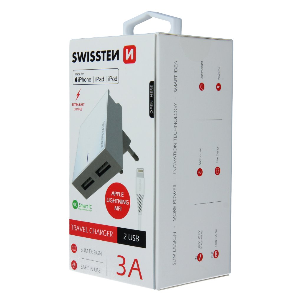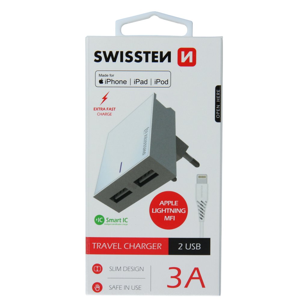 Swissten sieťový adaptér smart ic 2x usb 3a napájací + dátový kábel usb / lightning mfi 1,2 m biely